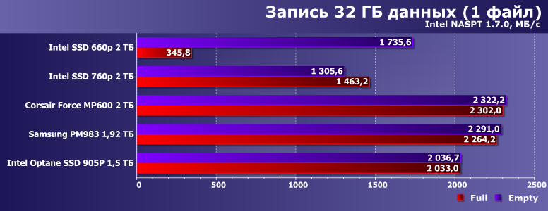 При записи важна память — но и способность контроллера «выжимать» из нее максимум тоже. Или не из нее, а «в обход» — как раз используя SLC-кэширование. Однако последний механизм при недостатке свободного места может... с хрустом сломаться, что хорошо демонстрирует Intel 660p. Порядка 350 МБ/с — как раз предел установленной в него QLC-памяти, что в однобитном режиме можно «разогнать» аж в пять раз. Пока хватает места под кэш — размер которого зависит от общего свободного места.