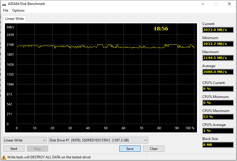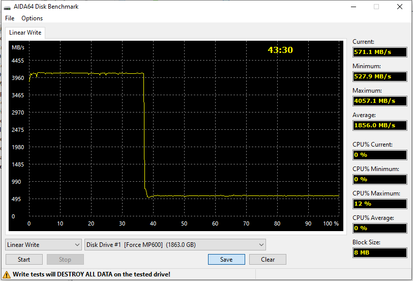При этом на скорости использование дорогих «мелких» кристаллов памяти никак не сказывается: максимум возможностей SM2262 раскрывался с такими кристаллами уже и на емкости в 512 ГБ. Дальше — только сама по себе емкость увеличивалась. А графики полной прописи данными практически идентичны: порядка 1,5 ГБ/с в SLC-кэш и в три раза меньше за его пределами. Последнее, впрочем, может быть вызвано и какими-то проблемами совместимости AIDA64, поскольку другие утилиты рапортуют о примерно гигабайте в секунду — но и последнее значение с точки зрения современности воображение уже не поражает.