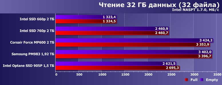 На чтении данных, впрочем, кэширование никак не сказывается. Или почти никак — Corsair (как и все накопители на Phison E16) немножко читерит, задерживая свежезаписанные данные в SLC-кэше, откуда они потом и читаются побыстрее. В процессе же заполнения данными эти файлы оттуда вытесняются — вот скорость их чтения процентов на 10 и снижается. Что немного, но «с приборами» заметно. А аутсайдером тут оказывается Intel 660p, но не по вине памяти — просто только у него четырехканальный контроллер, который больше сам по себе «не может».