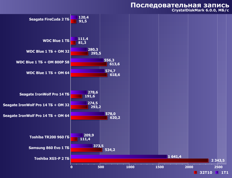И, раз уж мы решили непосредственно сравнить накопители разных типов, нам потребуются еще три SSD. Но чтобы сравнивать с винчестерами, нужны «большие» SSD — а то иначе как-то даже и не интересно. Поэтому мы решили остановиться на Toshiba TR200 960 ГБ, Samsung 860 Evo 1 ТБ и Toshiba XG5-P 2 ТБ. Первый построен на базе самой бюджетной SATA-платформы, второй — устройство среднего класса (а если говорить только о SATA-накопителях, то один из лучших их представителей), третий — перспективное NVMe-устройство, причем максимальной (среди всех изученных) емкости. Заметим, что винчестеры на 1-2 ТБ и сейчас составляют немалую долю поставок именно для ПК и ноутбуков. И твердотельные накопители уже тоже могут предоставить такой объем пользователю. Естественно, дороже — но и быстрее. А насколько (или во сколько раз) конкретно — сегодня и посмотрим.