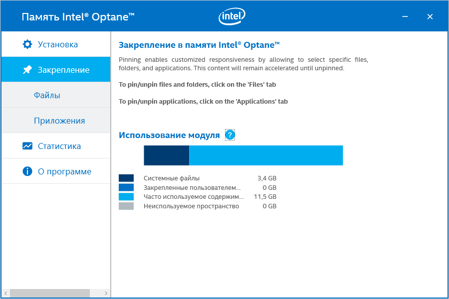 Но новой и самой интересной является вкладка «Закрепление». Даже если ничего настраивать не планируется, здесь можно посмотреть информацию об использовании накопителя. Как видим, на невытесняемые системные файлы отведено 3,4 ГБ — это тот необходимый минимум, который позволяет системе быстро загружаться и работать. А теперь вспоминаем, что более 10 лет (начиная с Vista) Windows на диске занимает 15-20 ГБ, причем со временем может «распухать», храня уже установленные обновления (для возможности их отката) и т. п. Одно это уже заставляет задуматься о кэшировании системного накопителя: тогда на «быстром» устройстве не нужно держать все эти десятки гигабайт, пусть поваляются на винчестере. А сколько места нужно в кэше — видно на картинке.