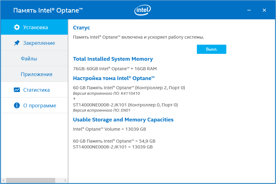Надо отметить, что в Intel за прошедший год не только расширяли ассортимент кэширующих модулей, но и дорабатывали программное обеспечение — как минимум, исправлены все ранее отмеченные недочеты. В частности, теперь не нужно самостоятельно освобождать место в конце винчестера перед включением поддержки Optane Memory, да и кэширование несистемного накопителя в RST реализуется за меньшее количество действий. Появились и новые «фичи» — причем как в RST, так и в упрощенной (тем не менее, достаточной для «простых» бюджетных конфигураций) утилите SetupOptaneMemory.