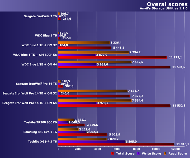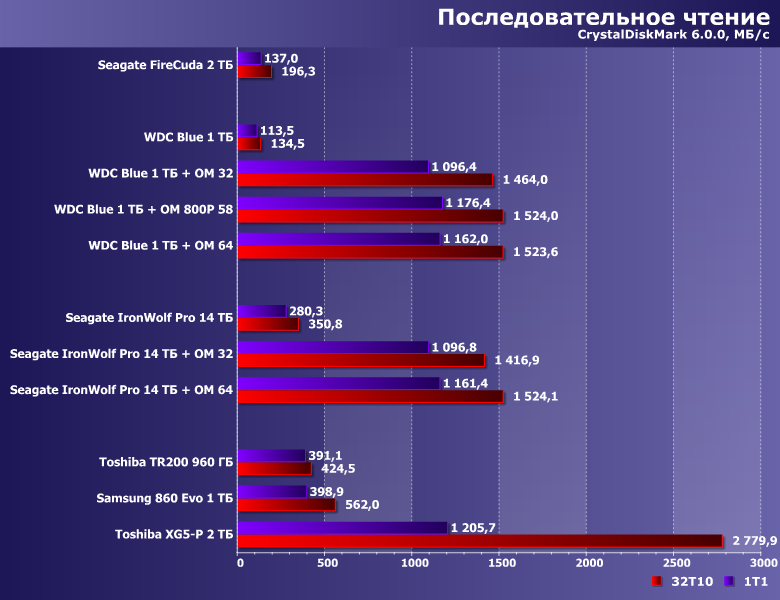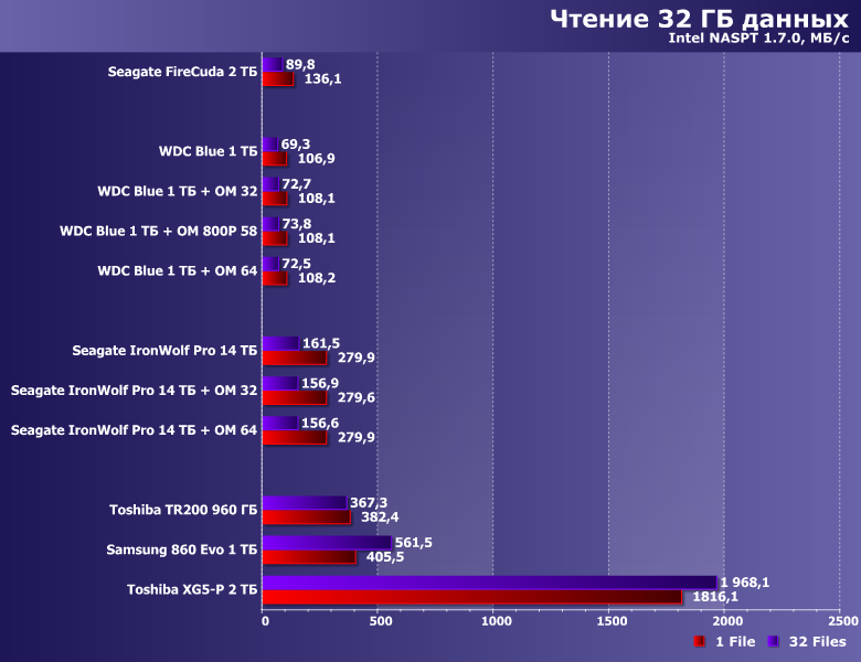 Также недавно мы протестировали Seagate IronWolf Pro 14 ТБ — один из лучших на сегодняшний день nearline-винчестеров. Понятно, что оказаться в обычном ПК хоть «в гордом одиночестве», хоть в паре с Optane Memory без прочих накопителей ему «не светит», но для получения оценки сверху он вполне подойдет, поскольку остальные модели на пластинах 3,5″ как минимум не быстрее. Опять же: а вдруг и при использовании такого винчестера просто для хранения данных есть смысл «пришпорить» его кэшем? Вот этот вопрос уже вполне практический, поскольку на фоне стоимости винчестеров на 10-14 ТБ цены модулей Optane Memory (особенно младших модификаций) заметными не кажутся. Поэтому проверим, как это работает с модулями на 32 и 64 ГБ.
