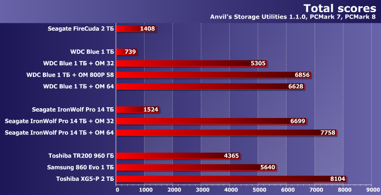 Тем более, что основная функциональность от них и не зависит — не умеючи можно, даже, ее и «испортить». А основным для всех систем кэширования является ускорение работы системы и приложений, хорошо заметное в тестах высокого уровня. Точнее, заметное до определенного момента — например, винчестеры друг от друга отличаются очень сильно, но встроенное кэширование FireCuda позволяет ему приблизиться к быстрым настольным моделям, хотя механическая и магнитная его составляющие в общем-то не лучше, чем у WD Blue. А Optane Memory «подстегивает» производительность еще сильнее — выводя ее на уровень, обеспечиваемый твердотельными накопителями.