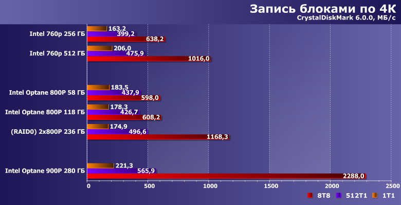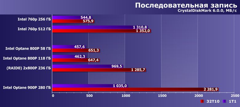 С чтением — все предсказуемо. Особенно в многопроточном режиме, где уже важен интерфейс, который тут медленный. Более того — даже RAID «сдувается», несмотря на оптимизм низкоуровневых тестов. Т. е. результат, конечно, существенно выше, чем для одиночного устройства, но на фоне как одиночного 900Р, так и недорогих «традиционных» SSD семейства 760р не впечатляет.