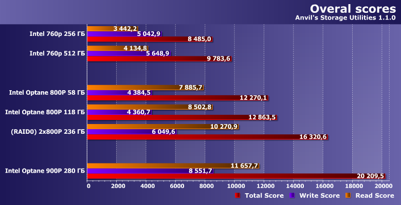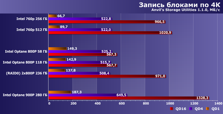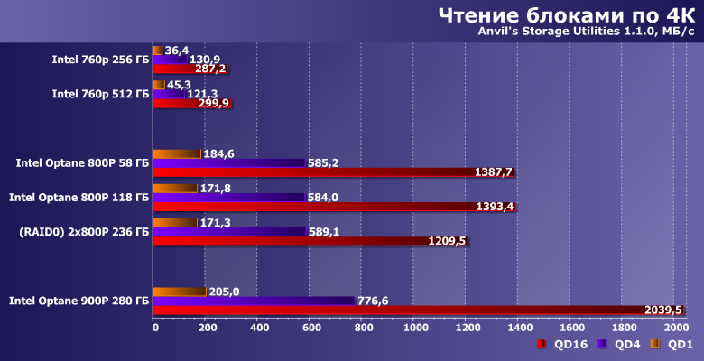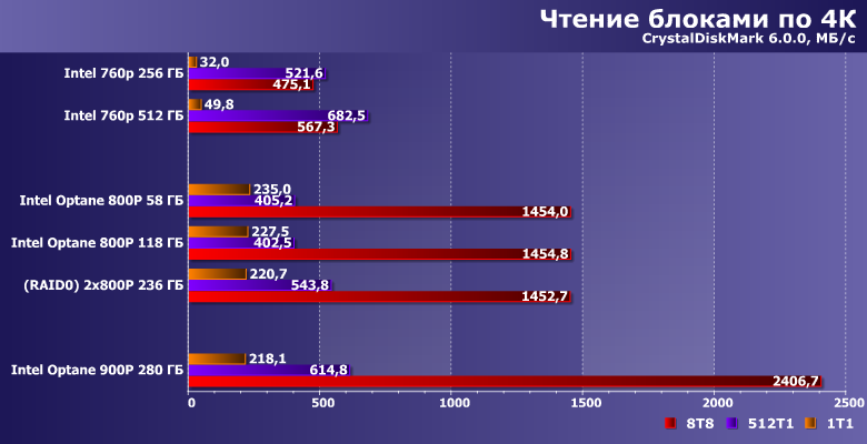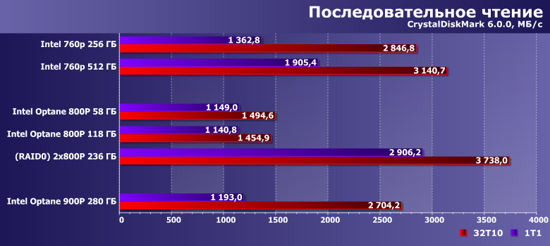 Как уже было сказано выше, стоимость 800Р перекликается со стоимостью 760р — только емкость за одинаковые деньги будет отличаться в четыре раза. А вот производительность можно сравнить напрямую. Что мы и сделаем, благо 760р на 256 и 512 ГБ уже изучали. И Optane SSD 900P 280 ГБ нам тоже пригодится — благо он в какой- то степени сопоставим с массивом из 800Р по ряду показателей. В принципе, этих трех устройств нам будет достаточно.