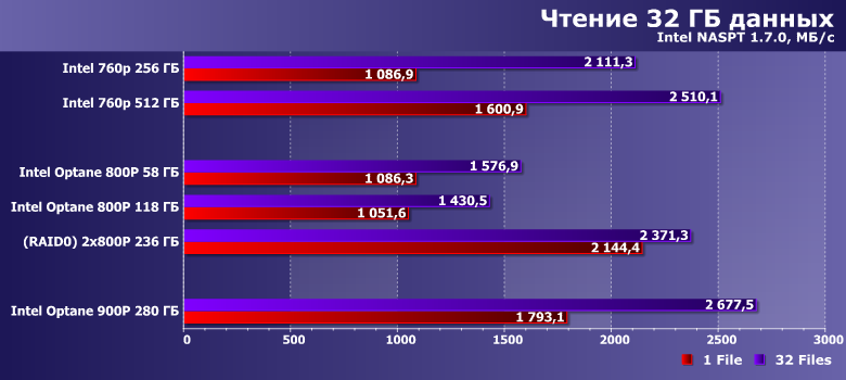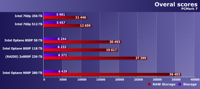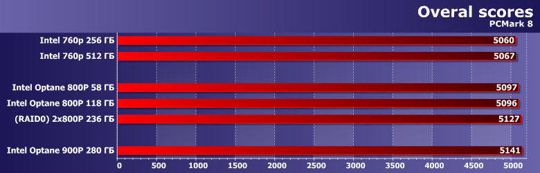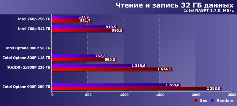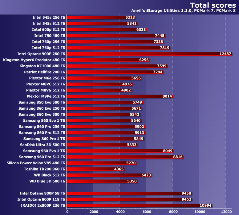А с учетом результатов тестов высокого уровня — чуть-чуть, но «над». Над обычными SSD, разумеется — такого вау-эффекта, как в случае 900Р, получить не удается даже при помощи пары устройств в RAID0.