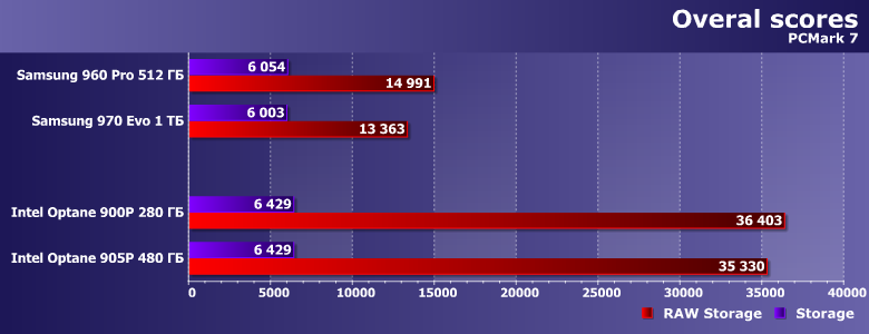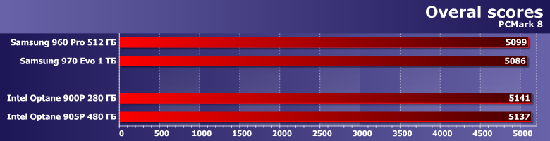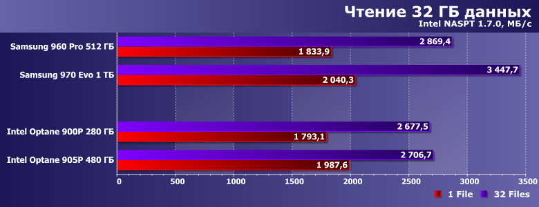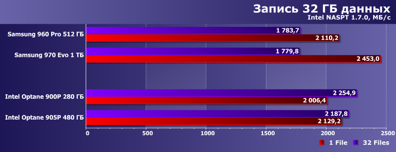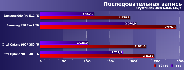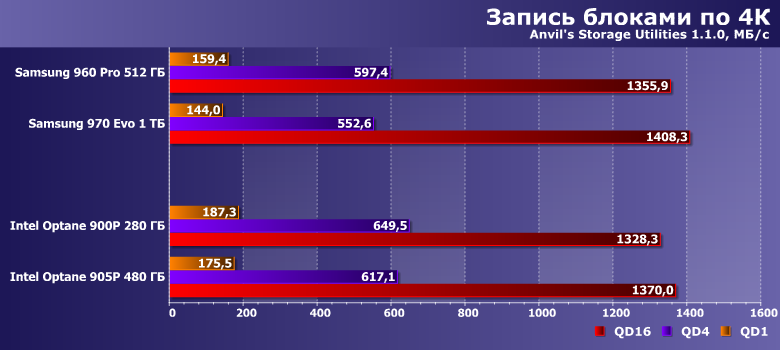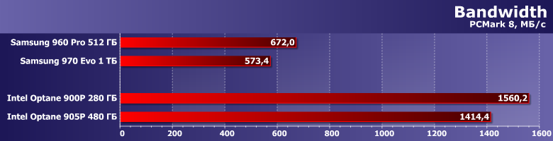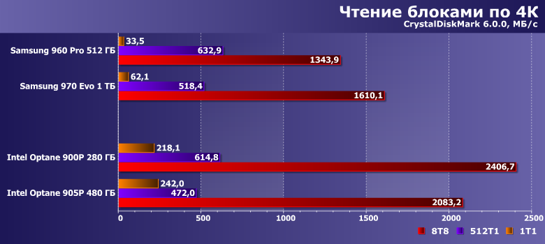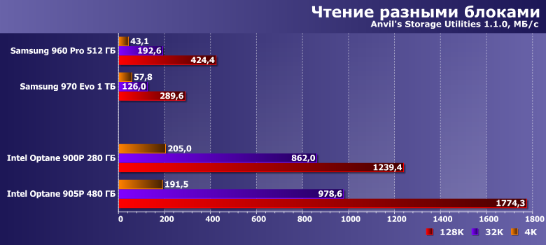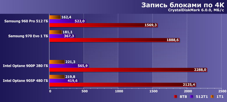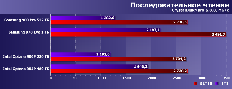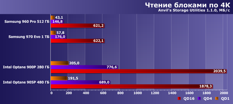 | Intel Optane 900P 280 ГБ | Intel Optane 905P 480 ГБ | Samsung 970 Evo 1 ТБ | Samsung 960 Pro 512 ГБ |