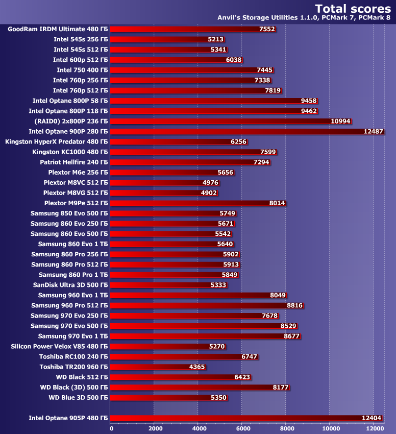 Если же все свести к одному результату, «подмешав» к нему и показатели бенчмарков высокого уровня, результат, естественно, тоже не меняется. Как 900Р всех модификаций, так и дополняющие это семейство представители линейки 905Р являются самыми быстрыми из представленных на рынке накопителей. Безотносительно того, насколько их потенциальные возможности получится реализовать на практике.