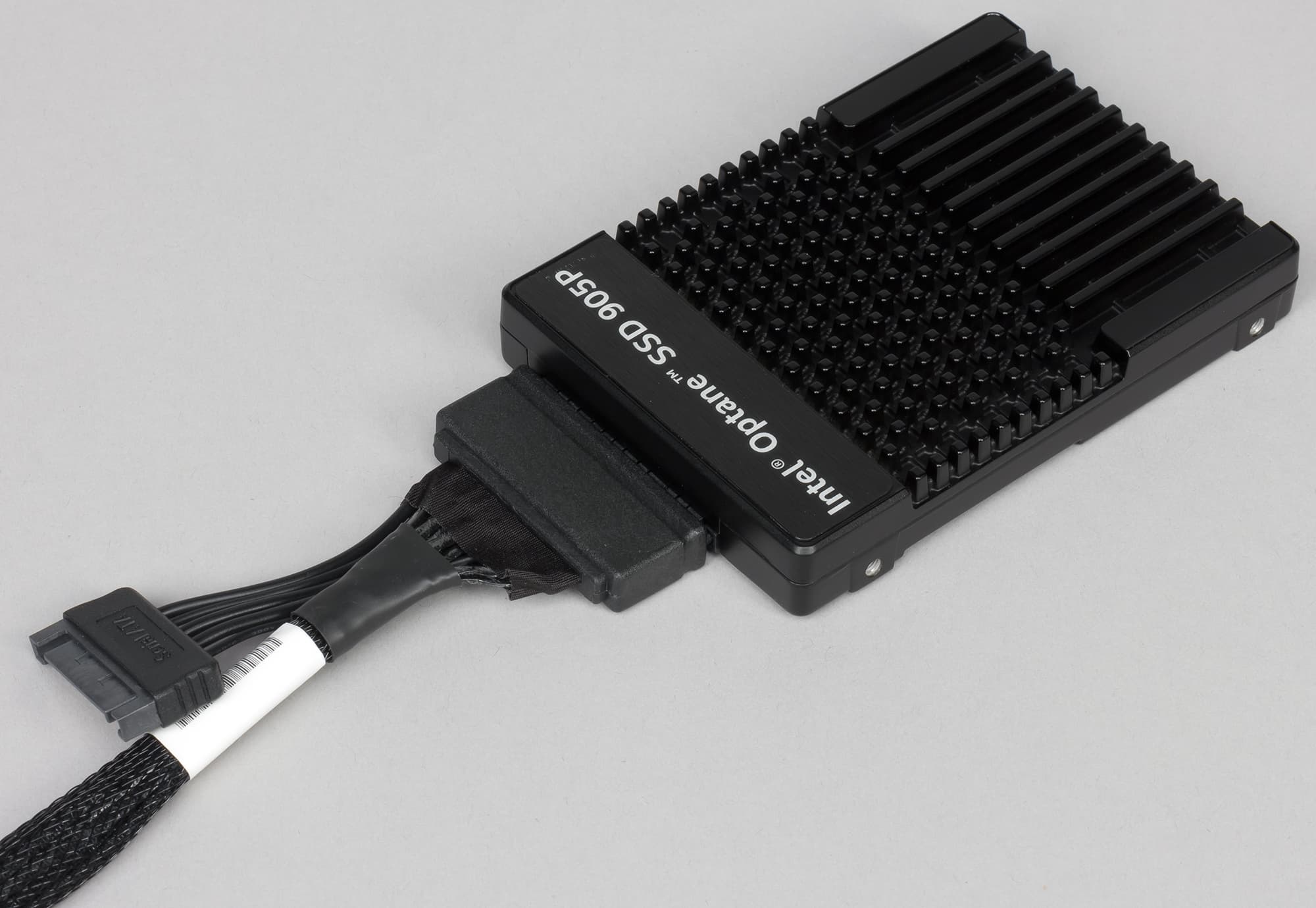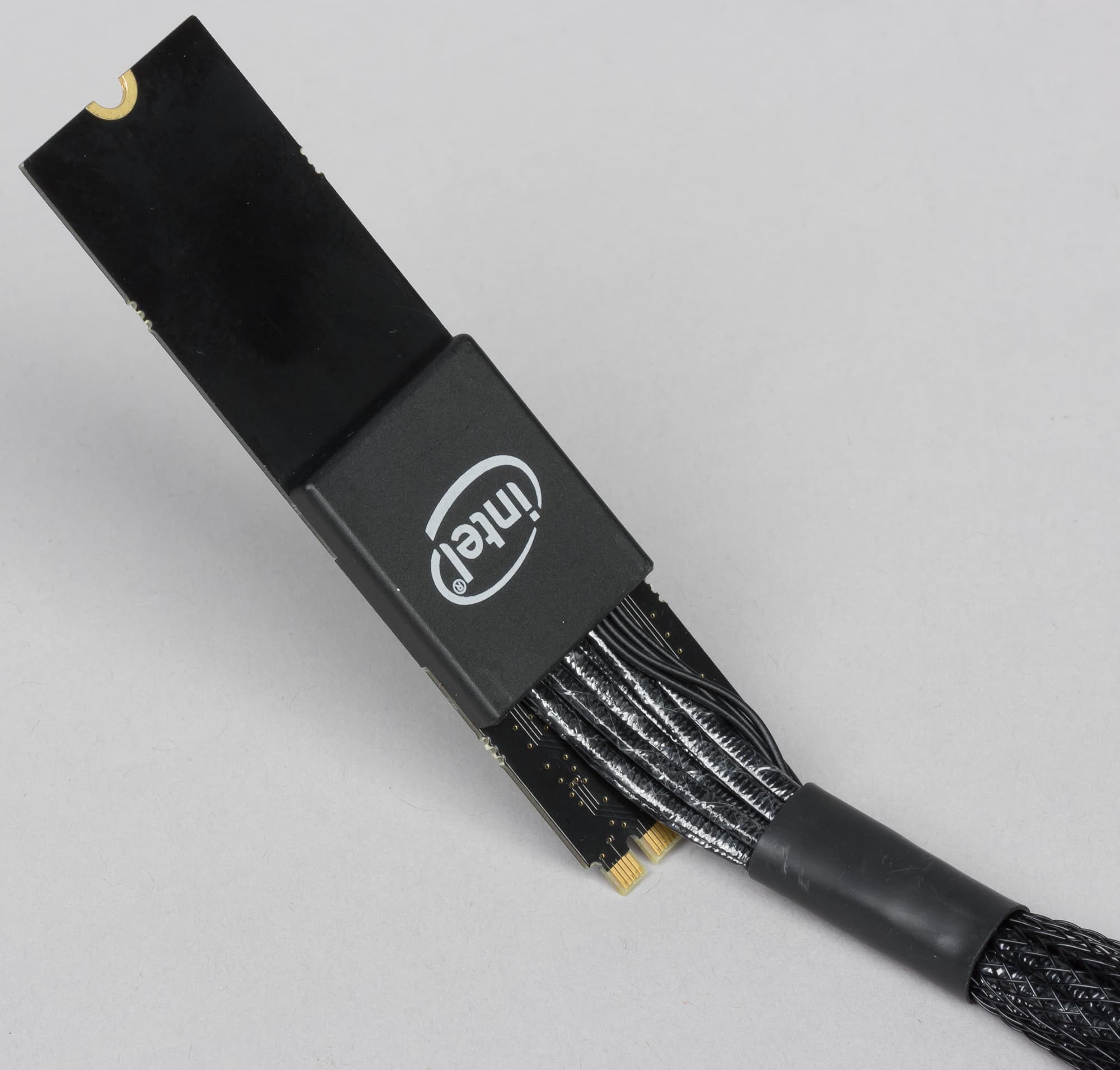 Отметим, кстати, что 905Р на 480 ГБ действительно добавляет гибкости при выборе — все-таки «лишние» слоты PCIe 3.0 х4 могут найтись далеко не во всякой системе (или быть чем-то заняты), разъемы U.2 есть только на отдельных платах, а с массовыми слотами М.2 из всех «оптановых» полностью совместимы были только кэширующие модули, да представители линейки 800Р — которые, как показала практика, старшим линейкам вовсе не «кровные», а, скорее, двоюродные родственники. Решением данной проблемы в Intel заодно и озаботились, вложив в комплект части устройств специальный адаптер, позволяющий подключать накопители с разъемом SFF-8639 к слоту M.2 и «обычному» SATA-питанию. Кроме того, компания начала комплектовать таковым и часть 900Р в аналогичном форм-факторе (что будет интересным тем, кому достаточно 280 ГБ) — они были давно объявлены, но первое время в продаже не встречались (в отличие от исполнения в виде карты расширения). Таким образом, накопитель может быть интересен и для собирающих компактную игровую систему, где единственный «полноразмерный» слот занят дискретной видеокартой. И, заодно, вопрос охлаждения накопителя решается сразу — его можно вынести в дисковую корзину подальше от горячих компонентов. Если, конечно, желание установить в нее именно Optane SSD вообще возникнет, но на больших выборках встречается всякое. Вплоть до желания купить не один, а два таких накопителя — тем более, что это обойдется дешевле, чем один вдвое большей емкости.