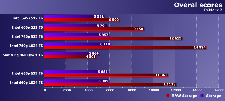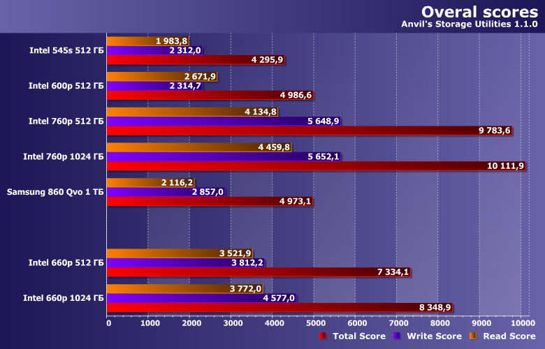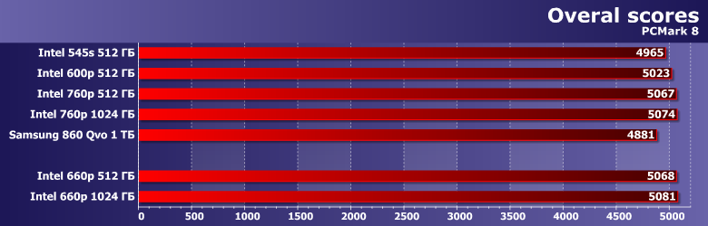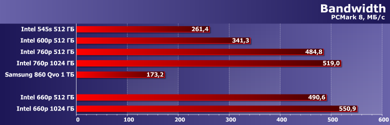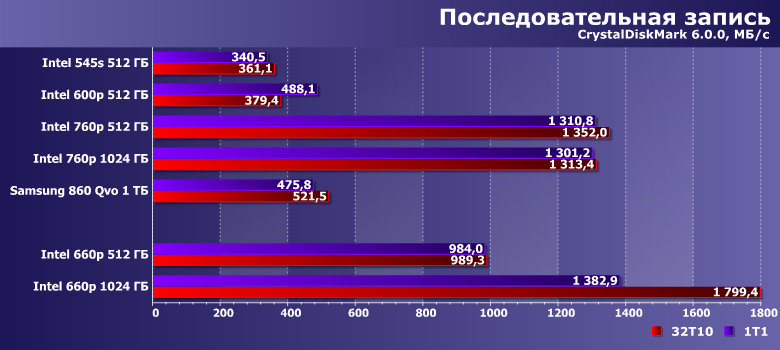 Предыдущая версия пакета демонстрирует нам тоже самое — 660р отстает только от 760р. Правда и довольно заметно: обе модификации 660р медленнее, чем 760p на 512 ГБ. Что, впрочем, неплохой уровень — формально быстрее SATA, хотя фактически и последних вполне достаточно для работы в качестве «системного диска».