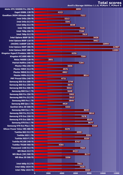 Впрочем, с точки тестов высокого уровня неважно — какой SSD. Главное, чтобы был :) Понятно — почему: даже самые бюджетные модели практически никогда не оказываются «узким местом», так что производительность зависит исключительно от прочих систем компьютера и/или его пользователя. Правда и нельзя сказать, что все идентичны: например, большинство SATA-устройств укладываются в этом тесте в 5000 баллов (редкие превышают этот уровень — и совсем не на много), а все NVMe начинаются с 5050, но этому можно и не придавать значения.