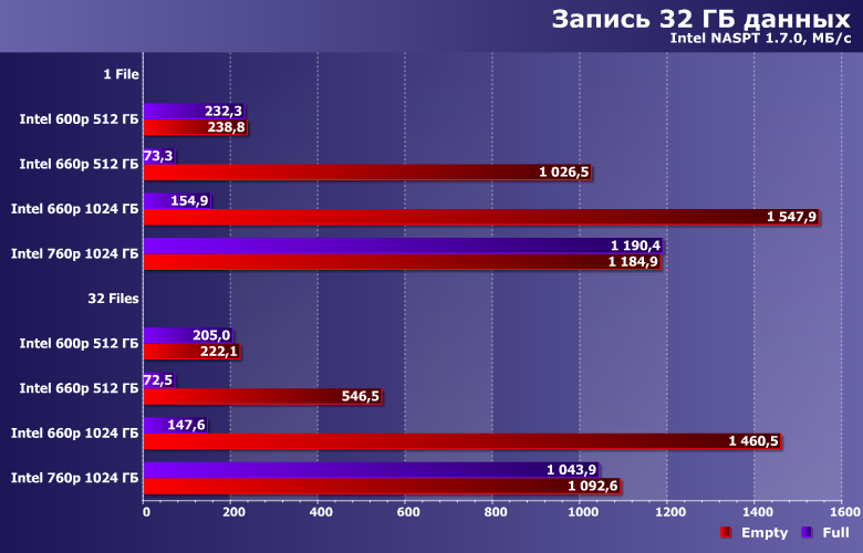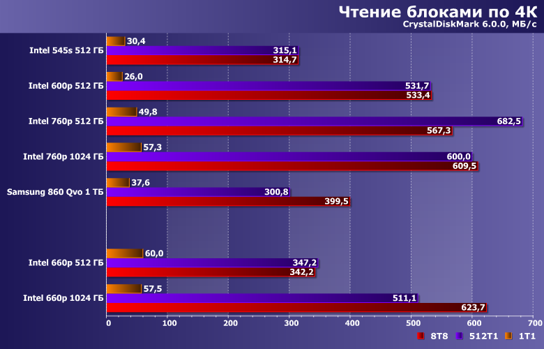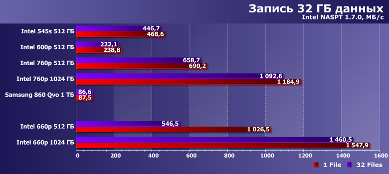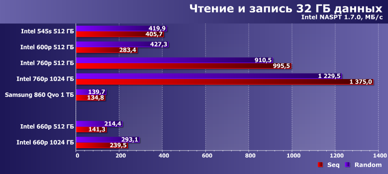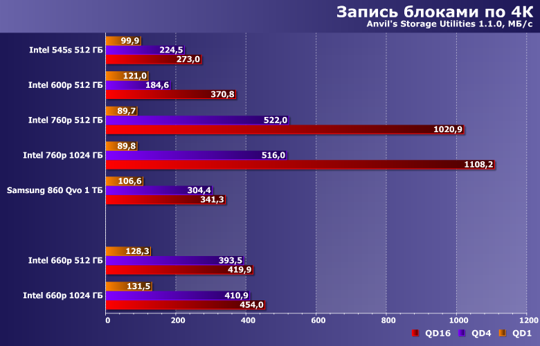 Казалось бы, все прекрасно — посрамлен даже 760р, не говоря уже о... Но! Вспоминаем об агрессивном кэшировании во всех случаях, когда это возможно. В данном случае это выполняется, хотя бы потому, что во время тестов занято лишь порядка 200 ГБ, т. е. и на младшей модификации 660р свободно больше половины емкости. Вот 860 Qvo использованием SLC-кэша не злоупотребляет, так что в его случае мы видим реальную скорость QLC-массива. А она ниже 100 МБ/с — и априори понятно, что у Intel вряд ли будет существенно больше.
