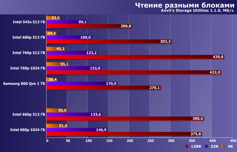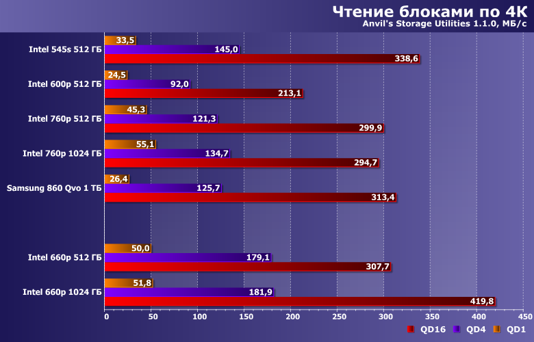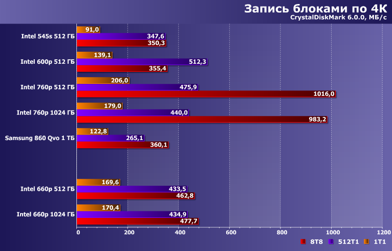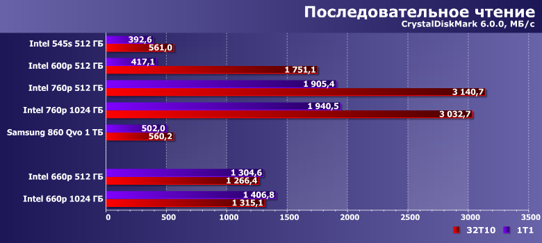 | Intel 660p 1024 ГБ | Intel 760p 1024 ГБ | Samsung 860 Qvo 1 ТБ |