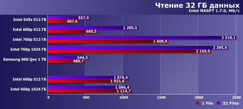 Как уже было сказано выше, с чтением особых проблем не испытывают любые типы флэш-памяти. В разумных пределах, разумеется — так-то собственная скорость у них разная. Но для SATA-устройств это вообще не важно, поскольку ограничителем оказывается и сам интерфейс — а переход на PCIe, разумеется, автоматом позволяет получить более высокие скорости. Но чуда не происходит — 760р в этих сценариях вовсе не рекордсмен, а 660р и до него далеко. Скорее можно говорить о примерном паритете со «старичком» 600p — но и это уже неплохо, поскольку и цены на уровне бюджетных SATA-накопителей, а то и ниже.