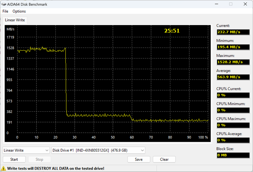 И оценка снизу, коей будет Indilinx 4XN80S. Казалось бы, Silicon Motion SM2263XT давно пора на покой, поскольку это еще первое поколение бюджетных NVMe-контроллеров разработчика, естественно ограниченное PCIe Gen3. В Indilinx же в его режиме работает чуть более серьезный номинально SM2263, к которому просто не стали припаивать DRAM и залили прошивку от младшей модели. Надо как-то складские запасы утилизировать, так что стоят такие накопители сейчас совсем копейки, позволяя заодно и запасы совсем залежавшейся памяти в дело пустить, а не выбрасывать. И, главное, многие покупатели до сих пор их выбирают специально. Не в новый компьютер, чаще всего, а в старый — где тоже поддержки Gen4 нет, а о совместимости стандартов сверху вниз многие просто не задумываются. Поэтому многие производители второго и третьего эшелона такие линейки с производства не снимают — и KingDian, кстати, тоже. Из положительных моментов — обычно подобные SSD всегда, хотя бы, с TLC в комплекте. На чем положительное и заканчивается, почти не успев начаться — контроллер слабый, память достаточно старая чаще всего, причем медленных модификаций. В Indilinx нам попался 112-слойный TLC-флэш SanDisk BiCS5, причем в виде 2-plane 512 Гбит. Вообще это не самая медленная модификация BiCS5 — есть и терабитные 2-plane кристаллы, которым «не повезло» стать QLC, но и не быстрая. Впрочем, как мы уже не раз убеждались, первому поколению бюджетных контроллеров Silicon Motion быстрая помогает как мертвому припарки, а вот для более современных контроллеров она уже важна. Но во что это выливается, стоит измерить в точности, благо представилась таковая возможность.