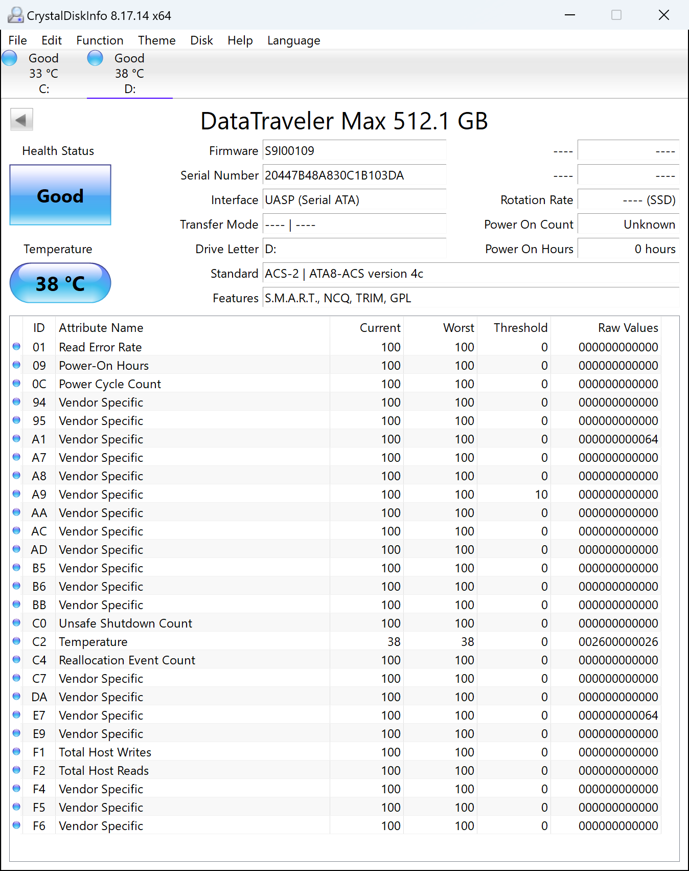 Пока же просто отметим, что CrystalDiskInfo остаток «ресурса» в процентах для этих накопителей не показывает, да и вообще большинство атрибутов корректно не распознаёт. Так что если эта информация важна, лучше пользоваться фирменной утилитой. Вообще же SMART у всех устройств на этой платформе своеобразный: никакой четкой стандартизации (как в случае NVMe, например) нет, так что очень многое зависит от конкретных прошивок и от того, что́ решил реализовать конкретный производитель. Даже количество пунктов в SMART у всех изученных нами флэшек разное.