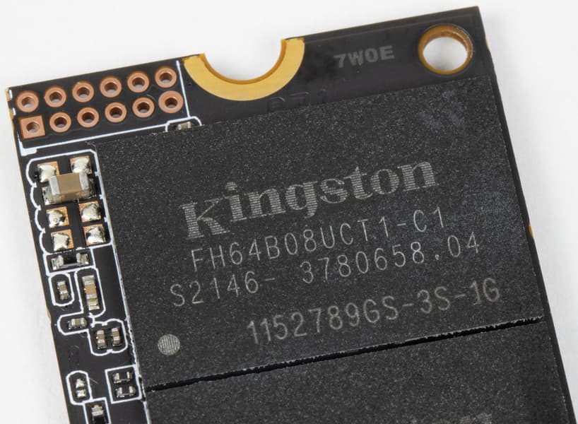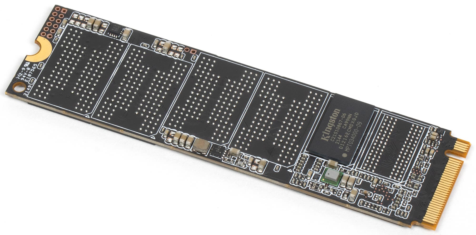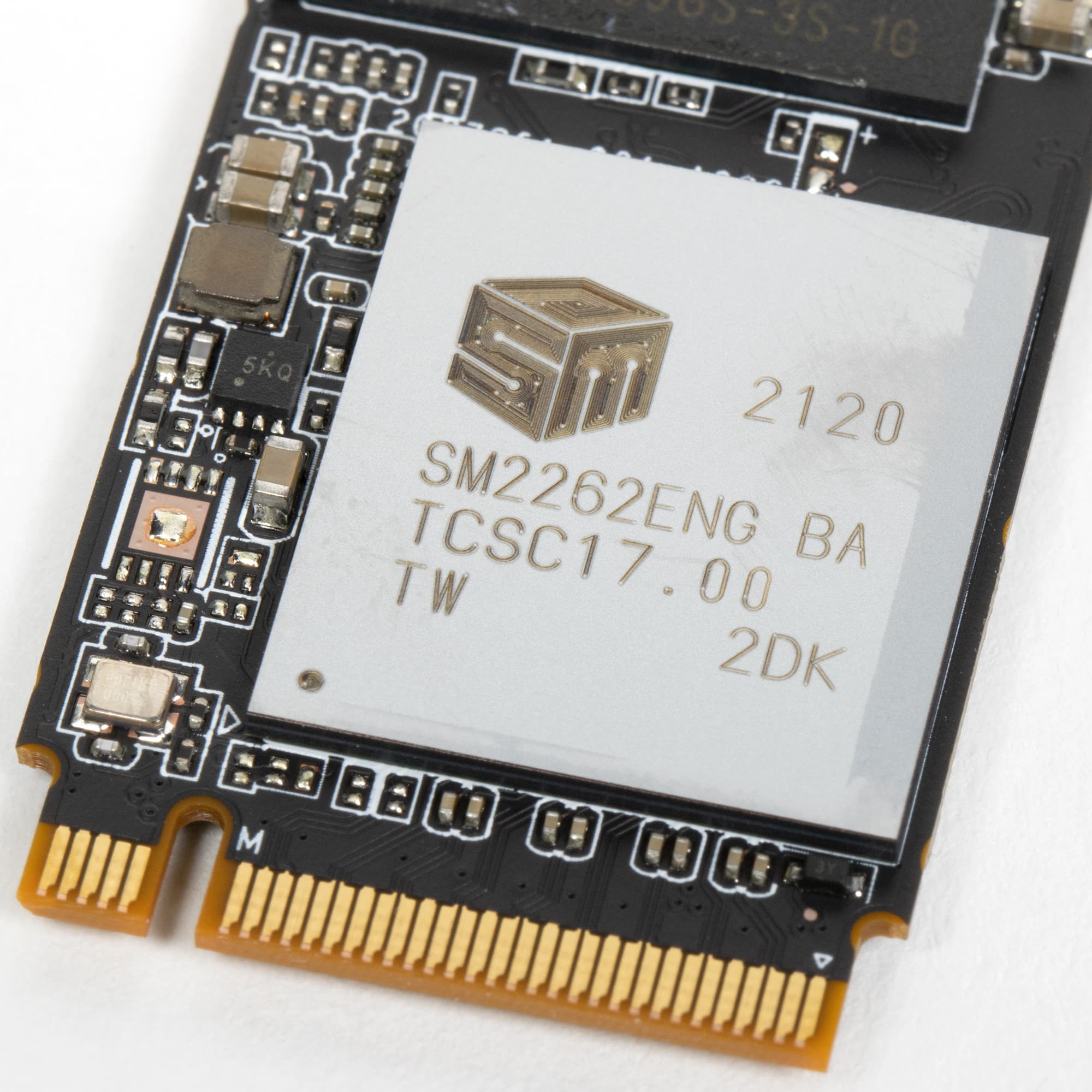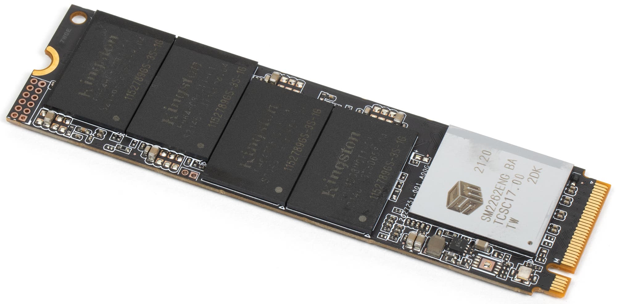 Причем все просто и предсказуемо. Контроллер Silicon Motion SM2262EN по современным меркам уже пожилой, но это мощное восьмиканальное решение — фактически последнее такое из эры PCIe Gen3, а с Gen4, повторимся, не все гладко в сегменте минимальной емкости. Без DRAM он не работает, так что 256 МБ DDR3L-1866 на плате тоже есть. Единственный недостаток младшего KC2500 — в остальных стоят два чипа памяти, так что шина работы с ней вдвое шире. Хотя на практике пока какого-то явного улучшения от этого так никому обнаружить не удалось. Ну и еще одна маленькая ложечка дегтя — изначально двухсторонний дизайн платы приводит к тому, что DRAM размещается на ее обратной стороне. При этом весь флэш в младшеньком поместился на основную. Т. е. сам накопитель условно односторонний, но вот в низкопрофильный слот M.2 все равно может не влезть из-за наличия элементов на обратной стороне. Но на деле это не так уж и важно — там, где в ходу низкопрофильные слоты, обычно не востребованы SSD на 250 ГБ. И наоборот — на наш взгляд основная сфера применения мелких топчиков это вообще десктопы: куда таковой добавляется к прочим накопителям для использования в качестве «системного» очень быстрого. А там слоты такие, что в них не то, что двухсторонний накопитель помещается — чаще всего и с M.2 22110 проблем нет.