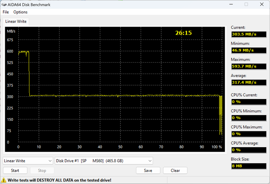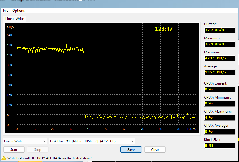 На первый взгляд всё не так уж страшно. Почти два часа времени на запись всего полтерабайта — это много, равно как и провалы ниже 30 МБ/с, однако производители бюджетных SATA SSD к таким ужасам нас всех уже приучили. Зато хотя бы четверть свободного места можно записать быстро. В теории.