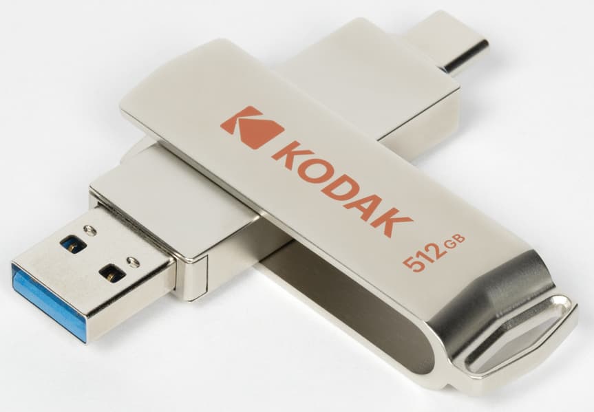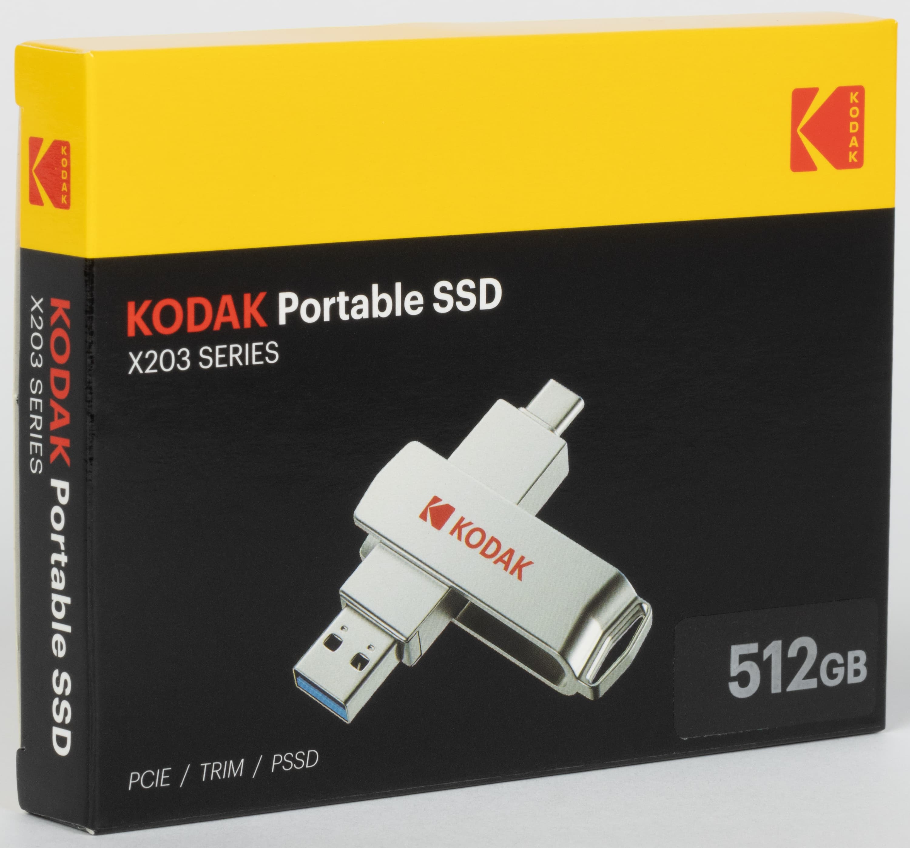 Это всё мы уже рассказывали, когда весной тестировали терабайтный Kodak Portable SSD X200. Несмотря на сходство названий, это немного разные внешне продукты. Х200 — типичный внешний SSD в виде коробочки размерами 91×45×10 мм и массой 35 г с кабелем, а X203 провода не нужны, поскольку он выглядит как обычная флэшка и укладывается в 70×16×9,7 мм и 26,6 г, несмотря на металлический корпус. Точнее, как флэшка до сих пор не совсем обычная, а снабженная USB-разъемами обоих актуальных типов. Мы вообще считаем, что на сегодняшнем переходном этапе такими должны быть все модели, но производители так пока не считают. Поэтому и нам пришлось наступить на горло собственной песне, вернув в тестирования «одностандартные» флэшки (иначе пришлось бы проигнорировать некоторое количество интересных устройств), но к конструкции X203 у нас претензий нет. Ну, разве что разъемы ничем не защищены от грязи, а поворотная металлическая скоба лишь ухудшает ситуацию с загрязнением и без толку увеличивает вес устройства. Но сам по себе такой дизайн популярен, покупателей не раздражает (как минимум, часть покупателей). И поскольку вариантов внешнего исполнения на рынке представлено много, то, значит, одного удобного для всех так за десятилетия и не удалось придумать: у всех свои достоинства и недостатки.