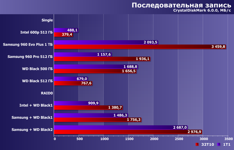 С записью все выглядит более корректно, но тоже не будем спешить. Пока же просто отметим, что, в лучшем случае, производительность одиночных накопителей можно сложить. Но паре медленных устройств, естественно, это не помогает догнать современное среднее — тем более, быстрое более высокой емкости.