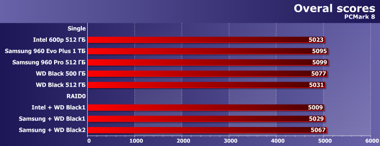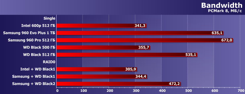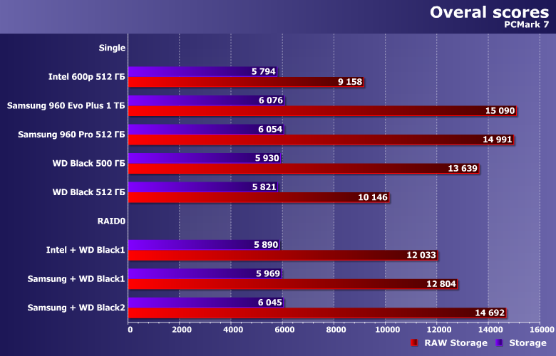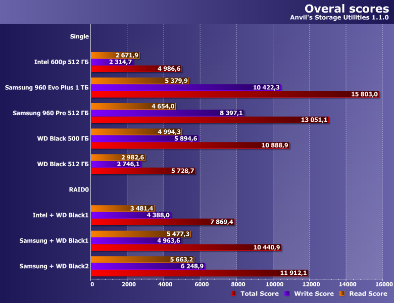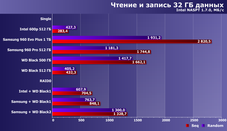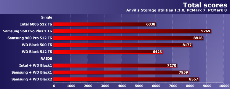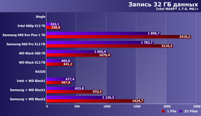 В принципе, все, что нужно знать про объединение двух разноскоростных устройств — ни один массив с участием Samsung 960 Pro не может «догнать» одиночный Samsung 960 Pro в любых сценариях. Что же касается пары из «медленных» Intel и WD, то иногда таковая оказывается быстрее любого из участников, а иногда — только самого медленного из них. В любом случае, если вдруг хочется получить максимум производительности — проще быстрый SSD и взять. Причем одного его будет вполне достаточно. Да и ситуация с емкостью давно уже «исправлена» сравнительно с положением дел десятилетней давности, когда из SSD могло понадобиться городить массив просто для получения 200-300 ГБ «одним куском».