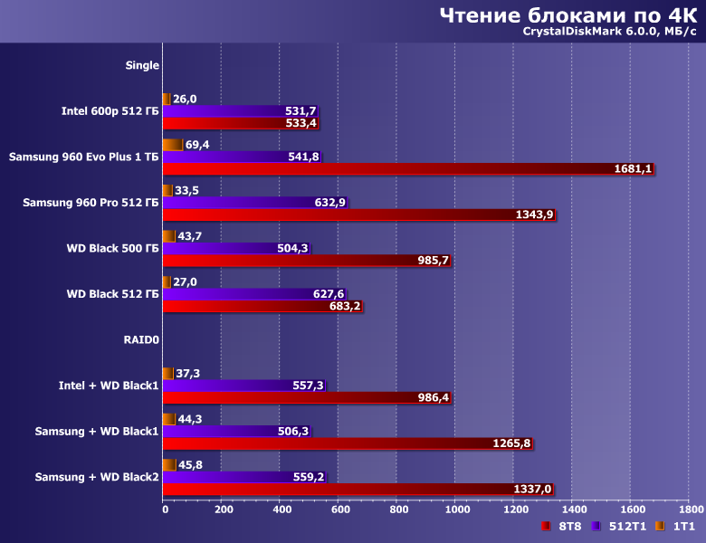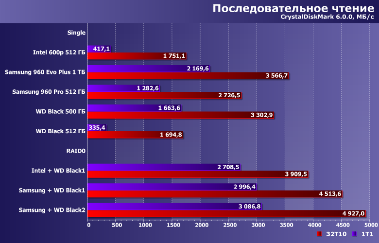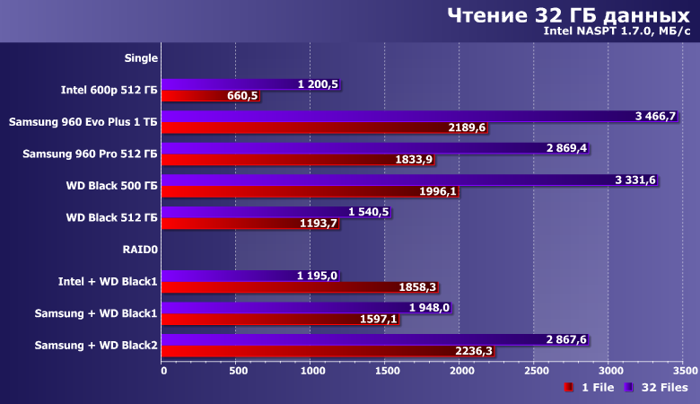 В однопоточном режиме скорость массива Intel+WD оказывается равной сумме скоростей его компонентов, что, казалось бы, хорошо. Однако переход к 32 потокам чтения заставляет массив работать со скоростью самого медленного устройства в паре. А в «асимметричных» конфигурациях с участием Samsung 960 Pro более медленный SSD фактически его только замедляет, но не наоборот.