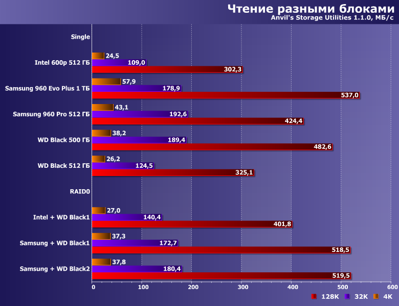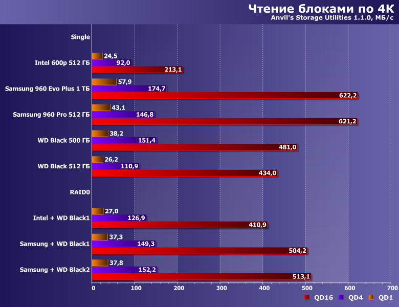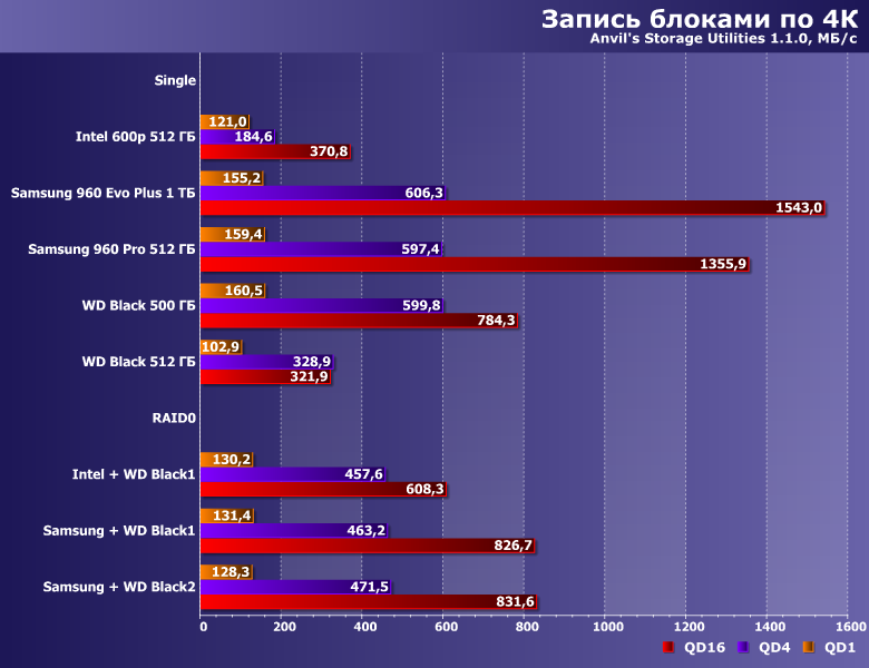 Довольно любопытная картинка — с одной стороны, массив, хотя бы, ничего не портит, с другой — практически ничего и не дает. Понятно почему — в этом сценарии вообще очень сложно разделить накопители на «быстрые» и «медленные». А учитывая то, что в прикладном ПО подобных операций немало, нет ничего удивительно и в том, что разные (иногда даже существенно-разные) SSD в бенчмарках высокого уровня ведут себя одинаково.