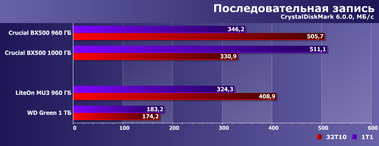 В данном случае можно ничего не придумывать, а просто взять две версии (QLC и TLC) Crucial BX500 из предыдущего материала. Можно было бы добавить к ним и что-нибудь более высокого уровня, но там уже глаза разбегаются: например, WD практически за одинаковые деньги продает и Blue 3D, и Blue SN550 на 1 ТБ. Второй в современной системе более предпочтителен, поскольку существенно быстрее — но тут уже сравнивать производительность не стоит даже и начинать. К тому же совместимости с SATA у него нет, а она иногда требуется. Значит, Blue 3D как 100% альтернатива — но тогда тоже не слишком интересно сравнивать скорости, поскольку если они действительно очень нужны, то лучше SN550. В любом случае, повторимся, наше мнение — лучше по возможности сразу же рассматривать накопители среднего уровня. Бюджетные нужны в специфических случаях — либо когда есть непреодолимое желание сэкономить хоть что-то, но не ценой емкости. Из чего следует, что такие устройства имеет смысл сравнивать только друг с другом — дабы в куче сора найти самый большой алмаз (предполагая, что он там есть).