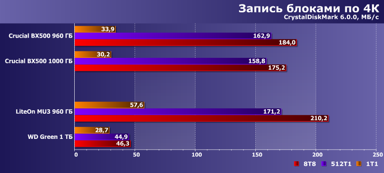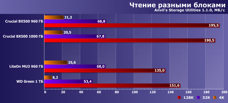 Отметим, что, вопреки существующим стереотипам, в программном обеспечении немалый объем работы приходится и на блоки, отличные от 4К — иногда даже меньшие, и очень часто — большие. А тут разница между испытуемыми вообще сокращается.