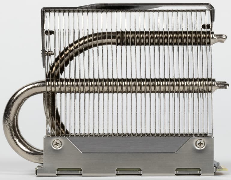 Однако это палка о двух концах. Вообще у радиатора задачи две: сглаживать пики тепловыделения и облегчать рассеивание тепла. Понятно, что с первым массивные конструкции справляются лучше, а со вторым — лучше лишь в идеальных условиях. Если SSD установлен в непродуваемой зоне, рано или поздно под постоянной нагрузкой он всё равно перегреется, разогрев перед этим окружающую среду в тонком слое вокруг себя. Но даже маленький вентилятор непосредственно на радиаторе хоть как-то, но воздух перемешивает, так что в неблагоприятных условиях может оказаться и куда более эффективным. А в благоприятных, как показывает практика, все эти сложные конструкции не являются необходимыми — достаточно будет типичной для многих плат штатной металлической пластинки (при наличии более-менее работающего продува пространства вообще, не обязательно конкретно пространства вокруг SSD). Недостаток же таких массивных систем заключается в том, что в некоторых случаях их установка затруднительна — например, могут мешать радиаторы на плате, просто не рассчитанные на высокие конструкции. Впрочем, иных недостатков у таких «наворотов» нет — они уж точно не хуже более компактных радиаторов. Просто бывает так, что и не лучше. Об этом тоже стоит помнить: массивный радиатор — сам по себе не панацея, и если тепло от него не отводить, то он просто будет чуть дольше прогреваться.