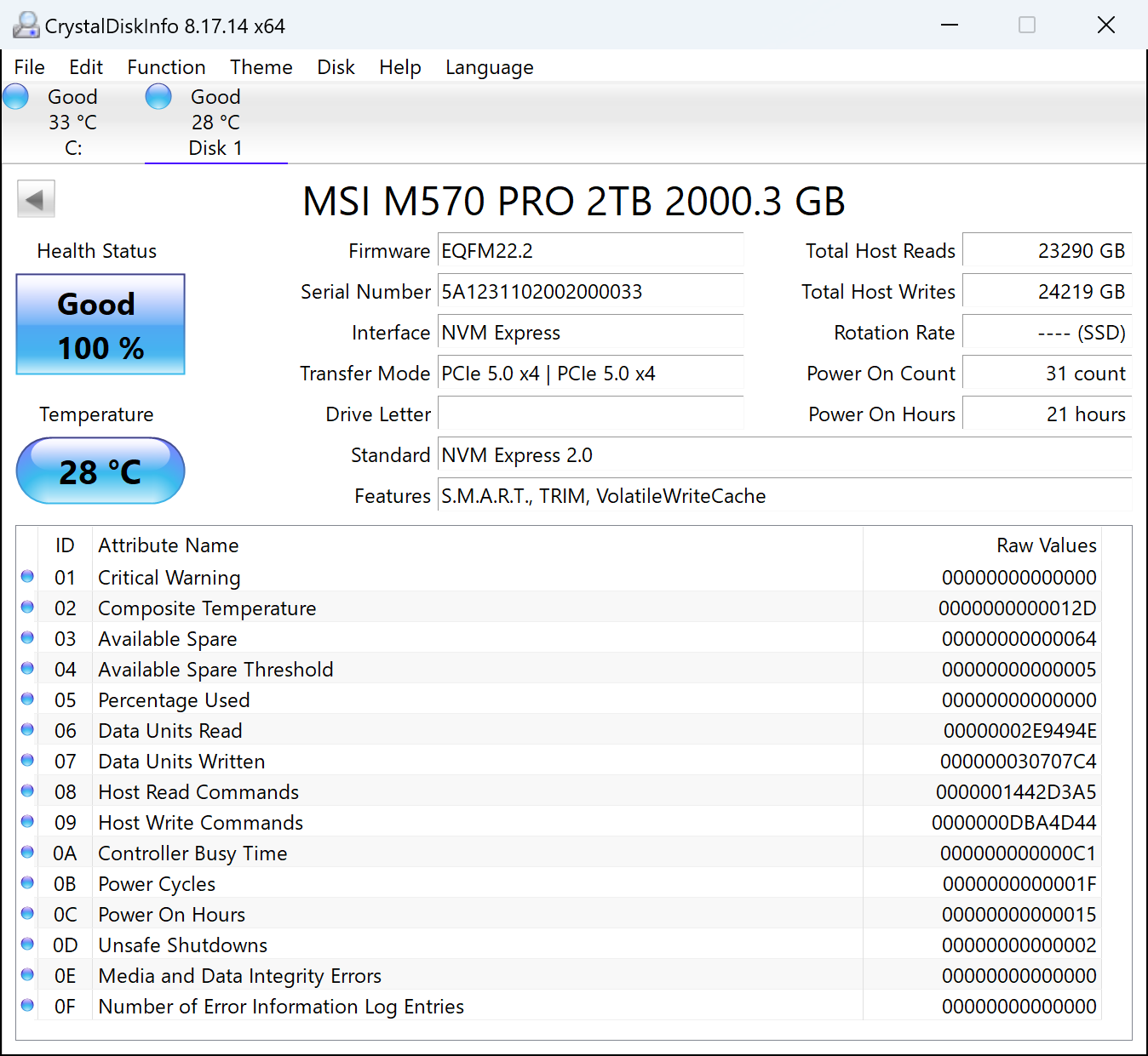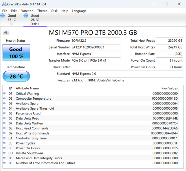 Они, как уже было сказано, у всех производителей одинаковые. И не только потому, что у всех одинаковый восьмиканальный контроллер, работающий с одним и тем же DRAM-буфером, у которого только емкость разная, но зависит от емкости накопителя: при 2 ТБ стоит микросхема на 4 ГБ и т. п. Скорость работы памяти в разных моделях разная, так что можно говорить о трех линейках: 1600, 2000 и 2400 МТ/с, причем не у всех в ассортименте есть все. И не у всех же есть самые быстрые, но и дорогие модели. У MSI — есть, но мы, напомним, сегодня будем тестировать условного середнячка емкостью 2 ТБ, тогда как полностью эта платформа «раскрывается» лишь на отметке 4 ТБ. И тем не менее, даже такие модели отсутствуют в ассортименте подавляющего большинства производителей. Собственно, и двутеры — одни из самых дорогих SSD на рынке, по цене нередко пересекающиеся с «четверками» из бывших топовых линеек. И это тоже причина пока не спешить в магазины — эксклюзивы дешево стоить не могут. Вот появится в сегменте Gen5 конкуренция — цены наверняка будет снижаться.