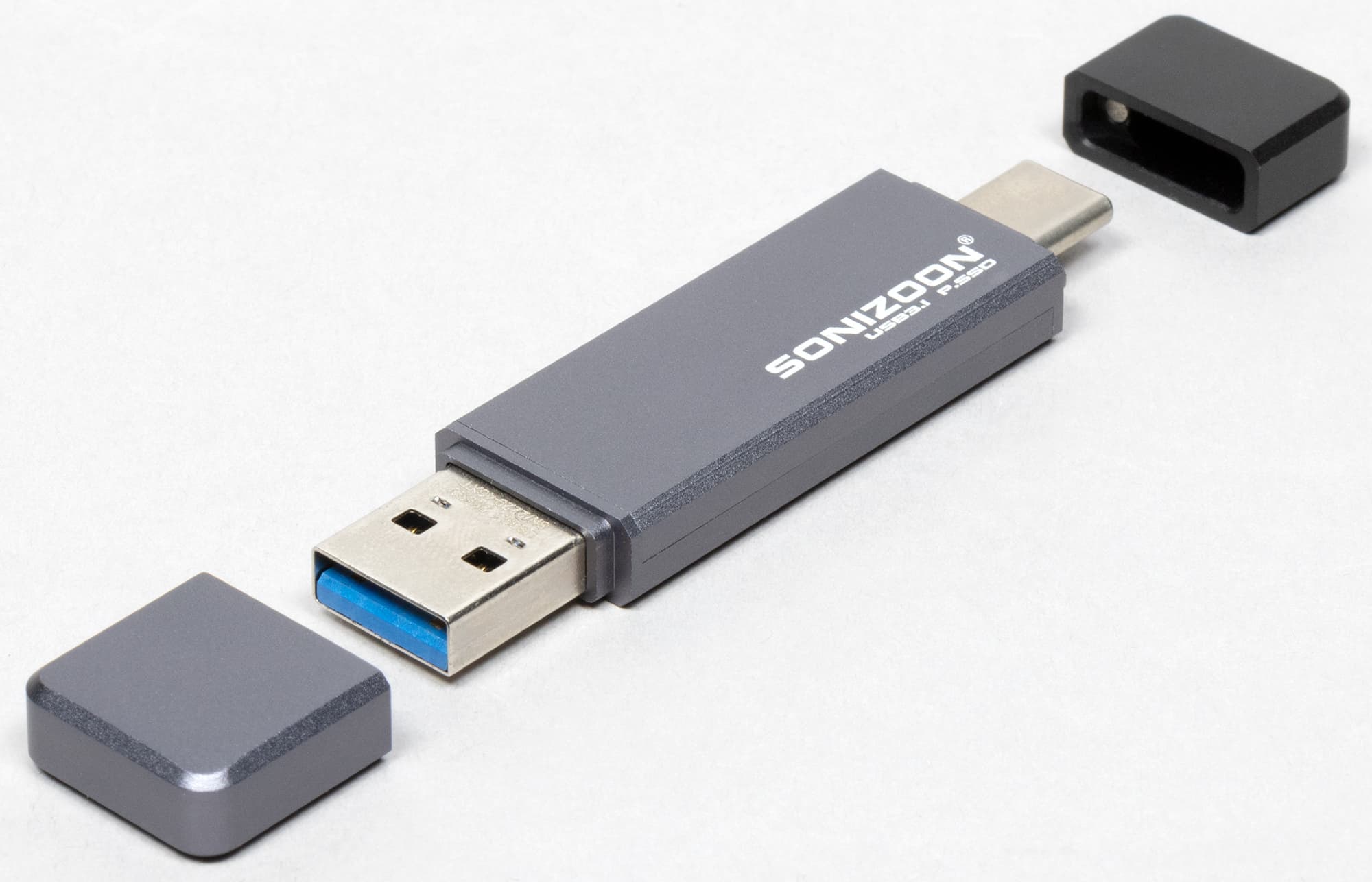 При этом «упаковаться» в габариты флэшки в настоящее время можно и без специальных контроллеров. Пару примеров такого рода мы уже изучали не так давно. В Sonizoon USB3.1 P.SSD было 256 ГБ MLC-памяти с контроллером Silicon Motion SM2246XT и USB-мостом ASMedia ASM235CM. Более дешевый (но и более медленный) Sonizoon USB3.2 T.PSSD содержал то же количество TLC-памяти с контроллером Maxiotek MAS1102 и мост USB—SATA VIA VL715. Но оба упомянутых SSD не слишком отличаются от типовых флэшек: габариты 69×17×7 мм и масса 14 г. И сразу два разъема обоих типов, так что можно обойтись безо всяких кабелей.