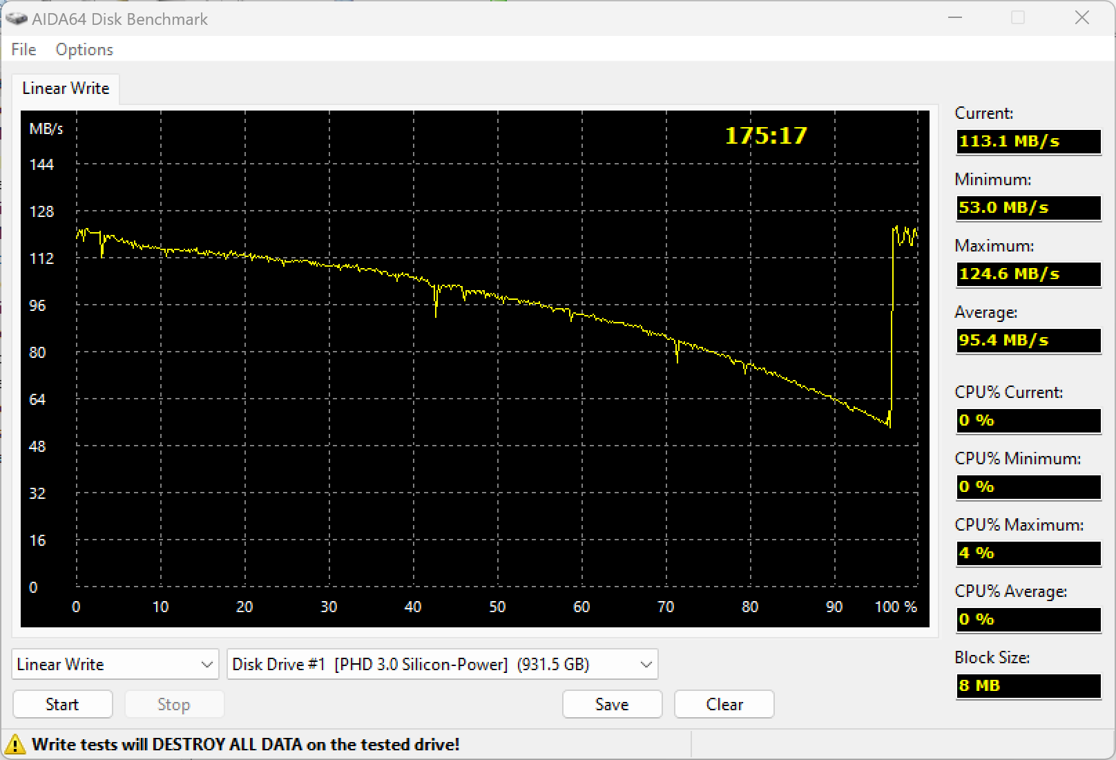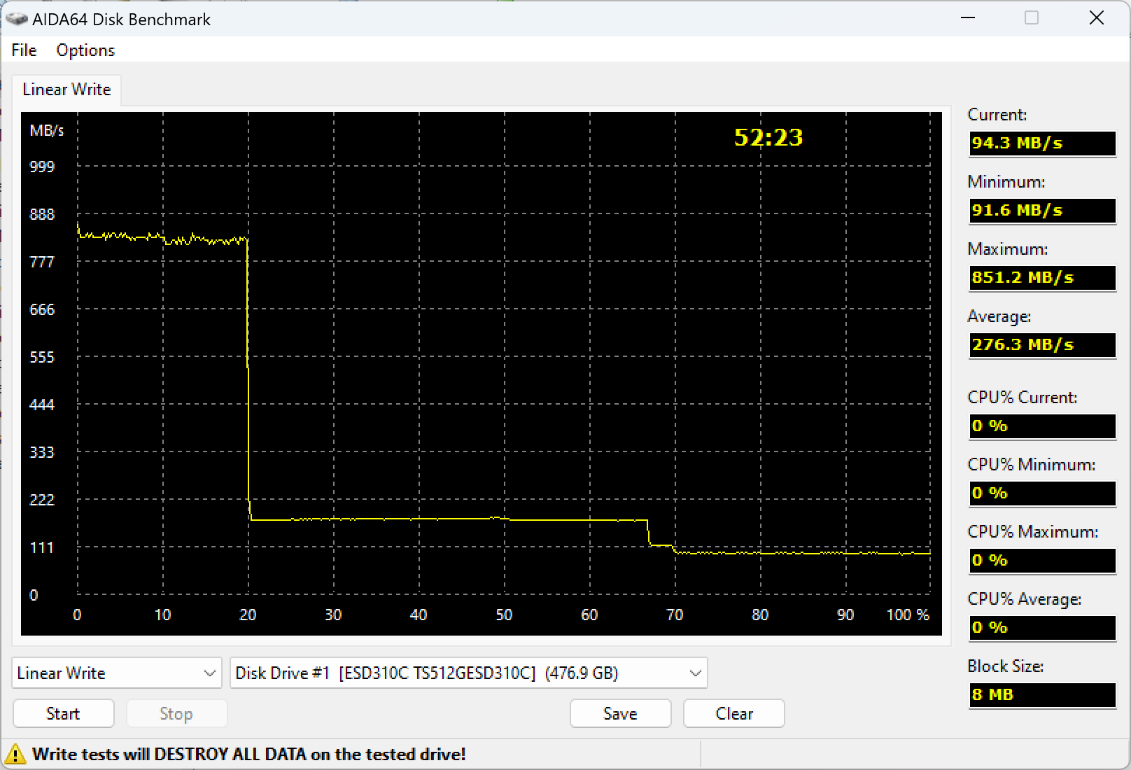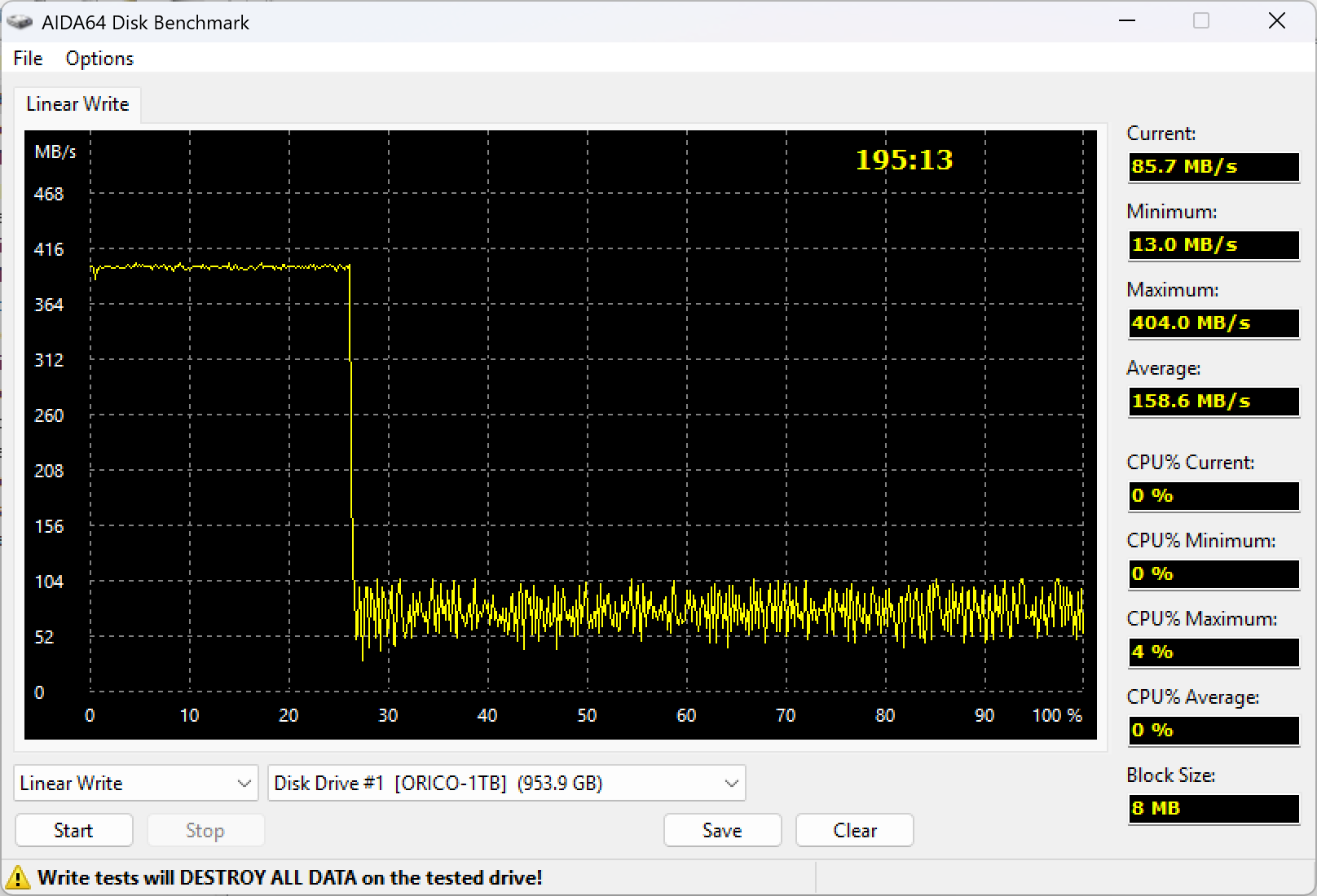 Ничего неожиданного — быстро писать в QLC-флэш можно лишь благодаря кэшированию. Поэтому все производители и делают SLC-кэш большим. За что потом наступает неминуемая расплата, если кэш кончится, а данные — нет. Их приходится переупаковывать, продолжая прием новых, что недорогим контроллерам дается с большим трудом — так что скорость падает существенно ниже 100 МБ/с, временами проваливаясь и до единиц мегабайт в секунду.