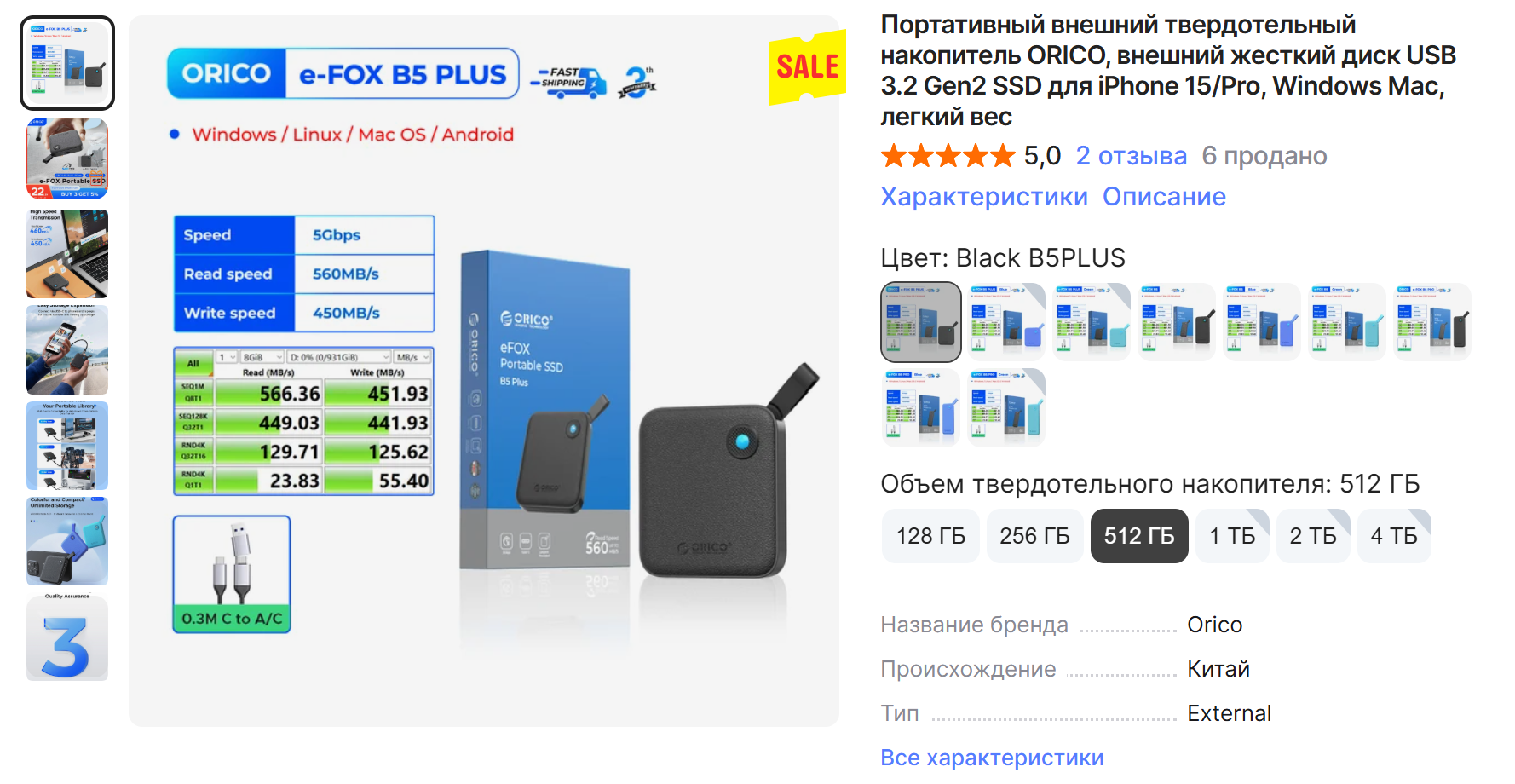 В принципе, для телефонов позиционируются все внешние SSD новой линейки eFox — это не одна какая-то модель. При этом неразберихи на тех же маркетплейсах бывает порядком — когда USB 3.2 Gen2 соседствует со скоростью 5 Гбит/с, хотя это еще Gen1 (ну или просто неоднократно переименованный USB 3.0). Масла в огонь подливает и сам производитель, с одной стороны указывающий пропускную способность интерфейса прямо в названии моделей (B5, B10 и B20 — это как раз USB 5/10/20 Гбит/с), а с другой — по старой китайской традиции пишущий на коробке про 560 МБ/с.