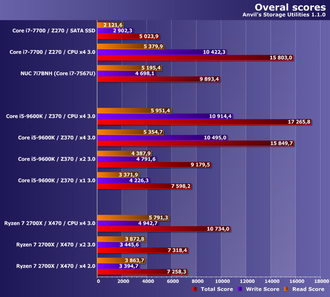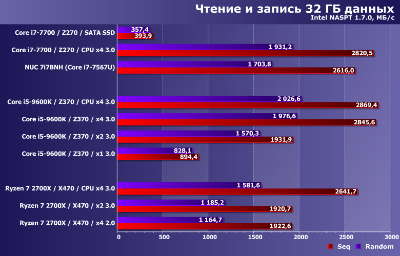 Просто все это следует учитывать, в том числе и читая обзоры, дабы не удивляться, что на вашей системе результаты получаются более низкими, чем в наших статьях. Винчестеры-то все равно на чем тестировать, SATA SSD уже некоторую зависимость от тестовой платформы демонстрируют, а накопители с поддержкой протокола NVMe (особенно топовые) вообще очень требовательны к окружению.