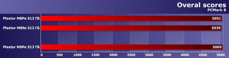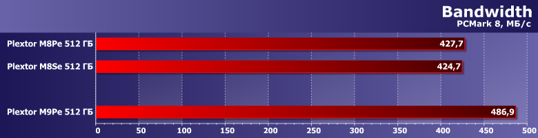 Как уже не раз было сказано, в тестах высокого уровня даже накопители разных классов ведут себя сходным образом, так что обратить внимание стоит лишь на одну деталь: если M8Se отставал от M8Pe (что немудрено), то M9Pe уже обгоняет обоих. Разница, впрочем, во всех случаях микроскопическая, и заметить ее можно лишь в тестовых утилитах — но это вообще обычное дело для большинства скоростных испытаний твердотельных накопителей.