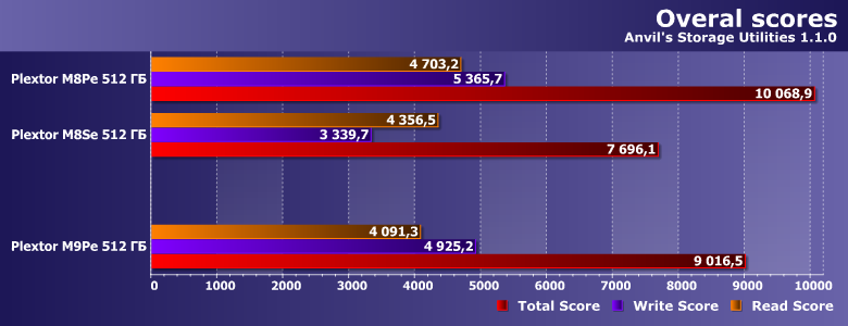 Учитывая доработки firmware за время использования контроллера, невосприимчивость этих сценариев к типу памяти (MLC или TLC) и увеличение скорости работы новых микросхем, уже отмеченное выше, нет ничего удивительного, что в этой паре тестов M9Pe оказался лучшим из трех накопителей Plextor.