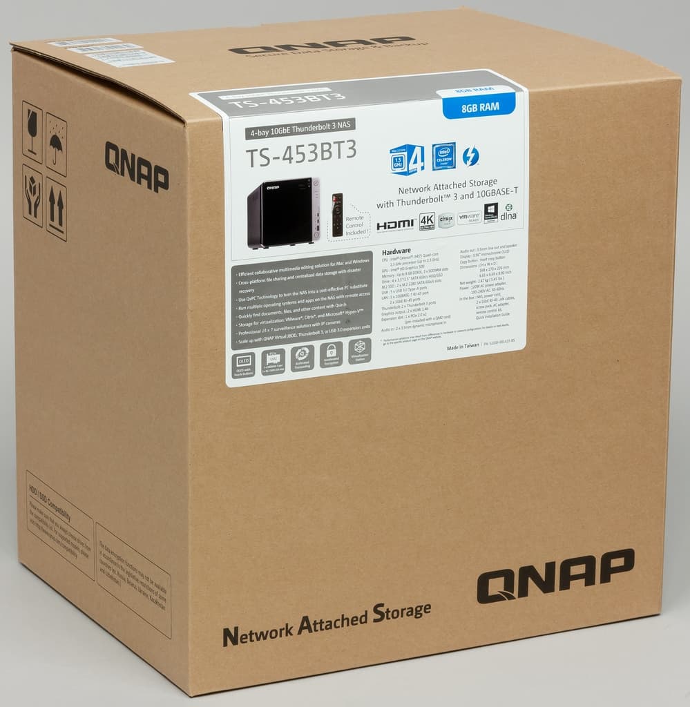 Компания QNAP предлагает сегодня более десяти моделей сетевых накопителей на четыре отсека формата 3,5″. Рассмотренный в этом материале TS-453BT3 выделяется среди них наличием интерфейса Thunderbolt 3 (есть еще одна модель с таким интерфейсом, но она уже более высокого уровня). Учитывая текущий статус данного интерфейса, а также использование мощной платформы, комплектацию картой с сетью 10 Гбит/с и слотами для SSD, цену на данную модель производитель установил достаточно высокую. На момент подготовки статьи она составляла около 100 тысяч рублей, то есть устройство явно «не для всех».