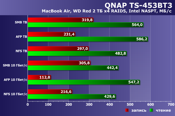 Дополнительно мы провели тестирование устройства с ноутбуком Apple MacBook Air 2018 модельного года. В настоящий момент этот производитель использует Thunderbolt 3 в качестве основного и часто единственного интерфейса для подключения внешних устройств. Сетевой накопитель подключался к нему напрямую через порт Thunderbolt 3, а также с использованием адаптера QNAP QNA-T310G1T и сетевого порта 10 Гбит/с. Тестирование проводилось с применением утилиты Blackmagic Disk Test с конфигурацией дискового тома RAID5 из четырех жестких дисков.
