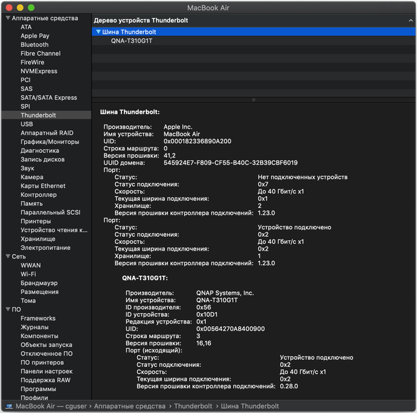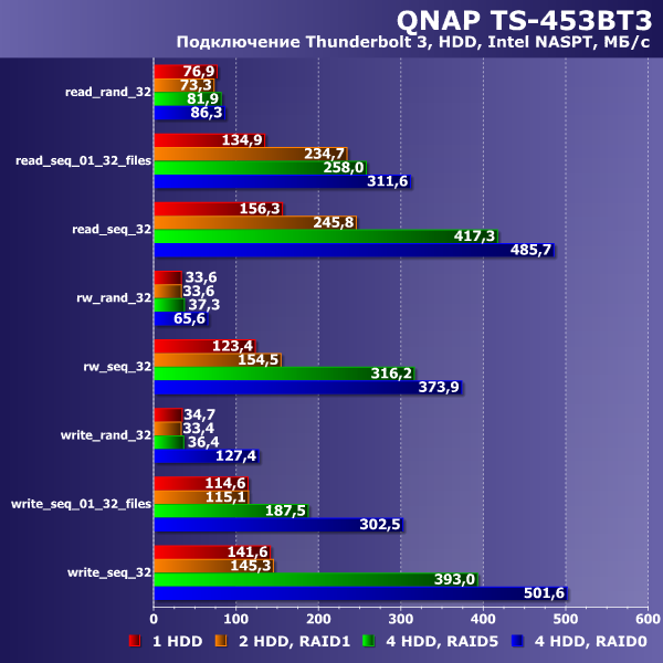 Для тестов с интерфейсом Thunderbolt 3 использовался ПК Intel NUC7i7BNH (см. статью о нем) с процессором Intel Core i7-7567U, 16 ГБ оперативной памяти, накопителем SanDisk SDSSDH3500G. Этот вариант тестировался как с прямым подключением к сетевому накопителю по Thunderbolt 3, так и с подключением через сетевую карту QNAP QNA-T310G1T. Заметим, что в этих режимах иногда встречались немного странные результаты. Мы их перепроверяли несколько раз, но похоже, что вопрос может требовать более глубокого изучения, учитывая, что Thunderbolt 3 мы тестируем все-таки не так уж и часто. Также мы попробовали работать с данным интерфейсом с MacBook Air 13″ 2018 года выпуска.