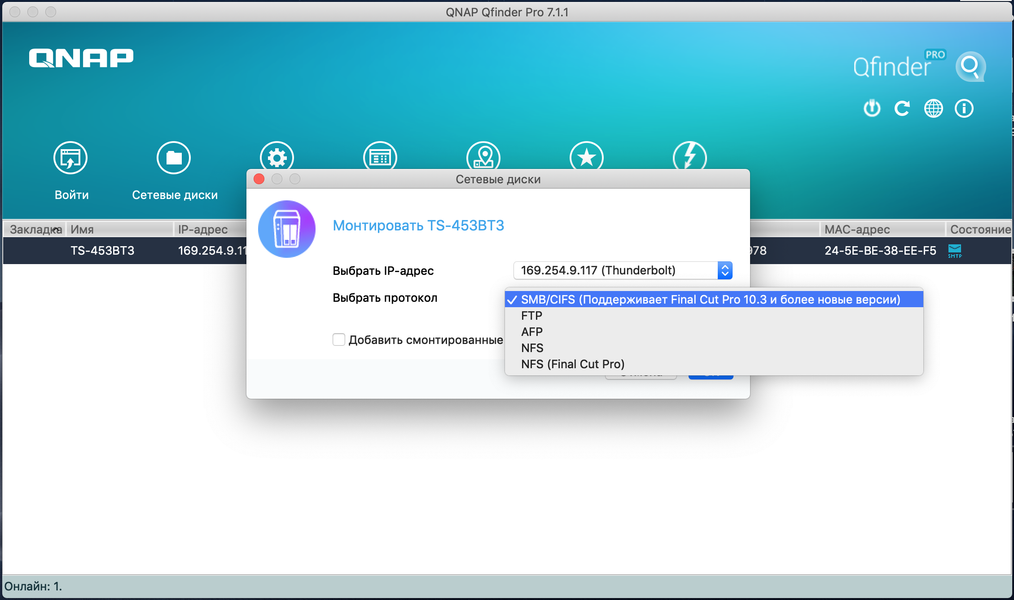Для подключения удаленного ресурса мы проверили все три распространенных протокола — SMB, AFP и NFS. Каждый тест проводился пять раз, на графике приводится среднее значение.