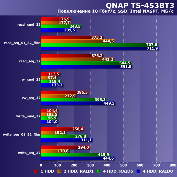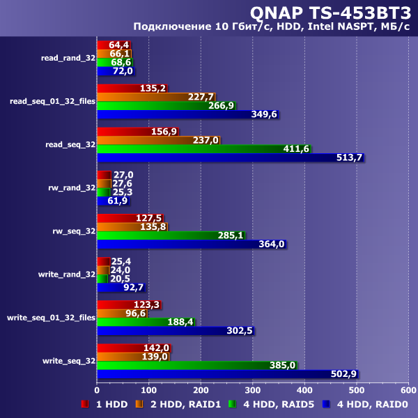 При работе с сетью 10 Гбит/с максимальные скорости чтения составили более 700 МБ/с. Это несколько меньше, чем можно получить на «настоящем сервере», но все равно впечатляет. Рост показателей на операциях записи ниже — здесь уже сложно говорить о существенном преимуществе перед массивами с жесткими дисками. Однако SSD легко отыгрывается на случайных операциях, где выигрыш составляет от двух до четырех раз по сравнению с HDD.