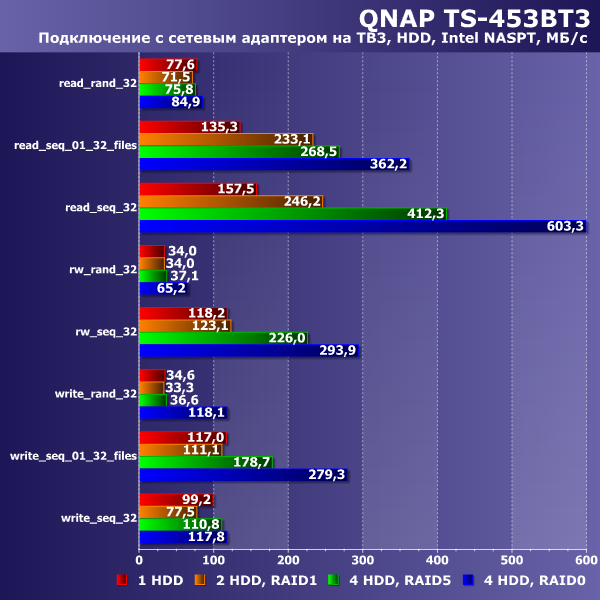 Добавление еще одного элемента в сетевое соединение в этот раз помогло поднять результаты на операциях чтения, но вот запись, как и с массивами на жестких дисках, выглядит не очень интересно.