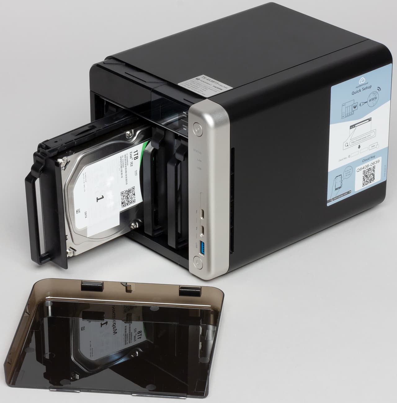 После этого использовать фирменную утилиту QFinder Pro или браузер и облачный сервис (инструкция находится на наклейке на корпусе сетевого накопителя). Существенных сложностей в этом процессе нет.