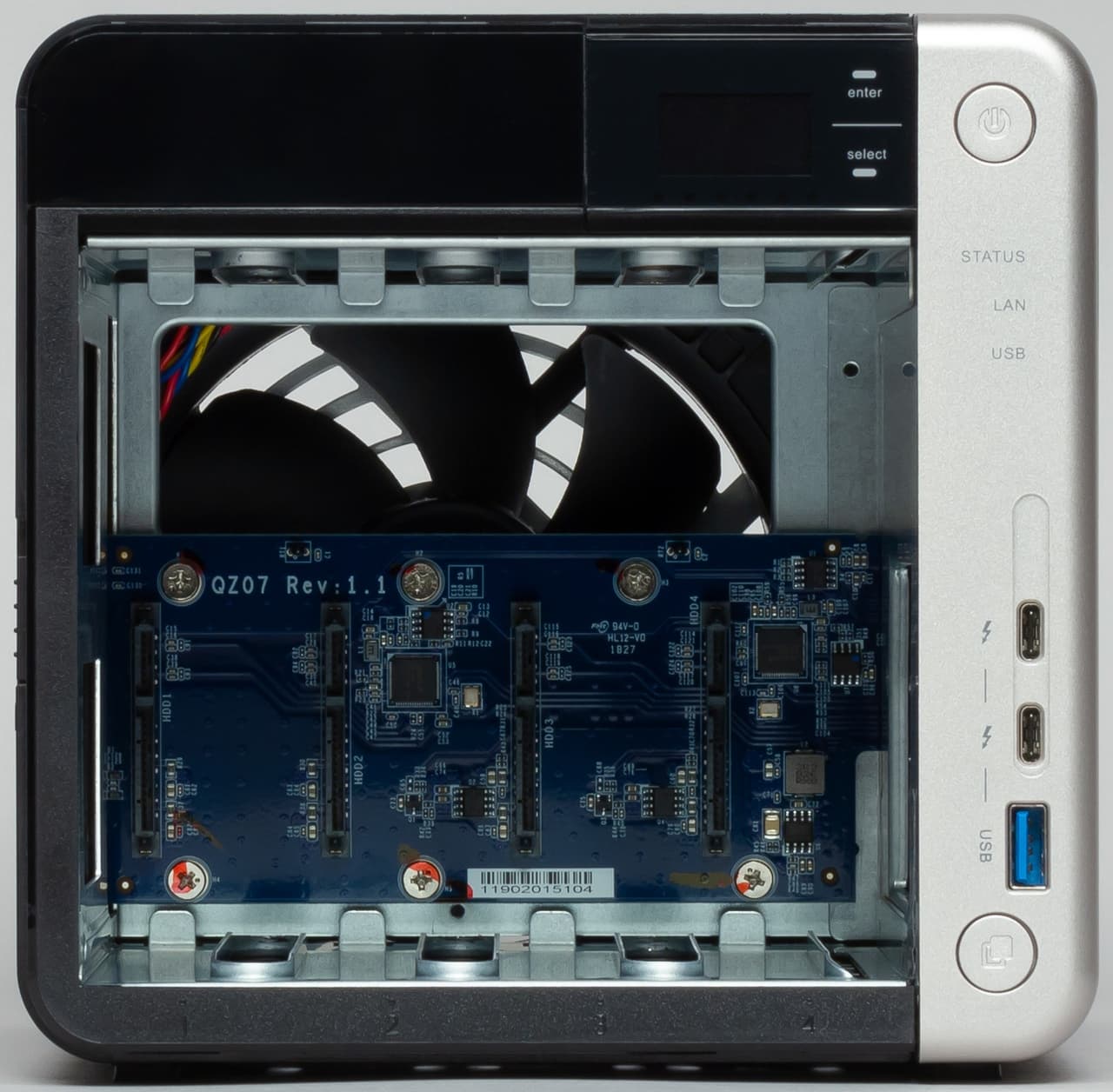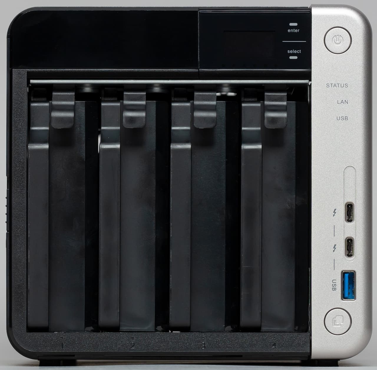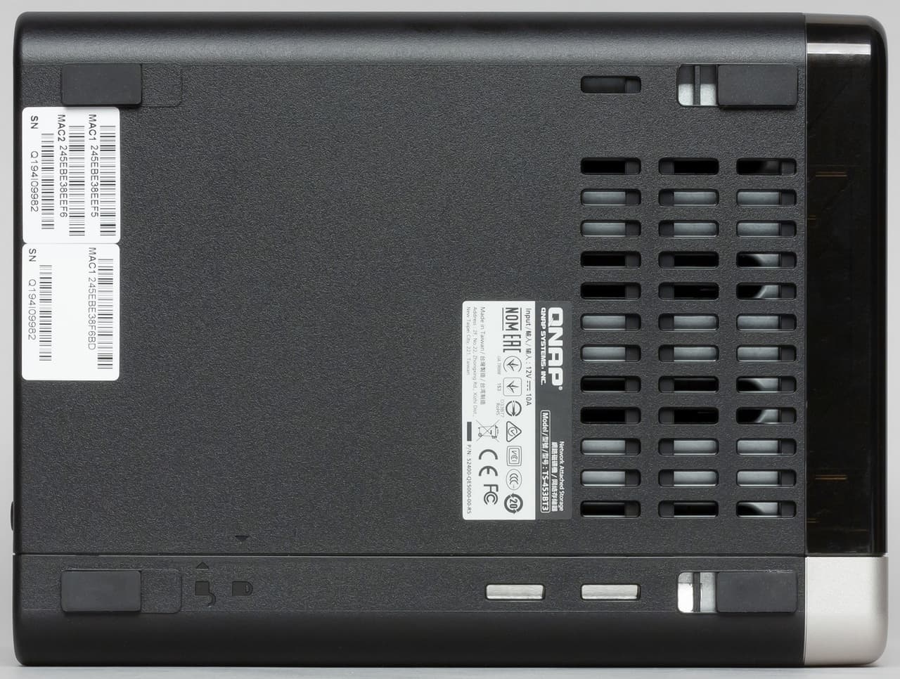 Справа вертикально идет блок с кнопками, индикаторами и портами на серой матовой полосе из пластика. Сверху вниз: кнопка включения питания, три индикатора (статус, локальная сеть (только основные два порта), USB), два порта Thunderbolt 3, порт USB 3.0, кнопка запуска копирования файлов. Как и у других моделей QNAP не очень строгим выглядит выбор цветов для светодиодов — в обычном режиме это зеленый (статус), мигающий желтый (сеть) и голубой (USB).