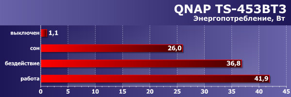 В режиме бездействия накопитель потребляет около 37 Вт, что больше, чем у другого устройства на аналогичной платформе, которое мы недавно тестировали. Вероятно, здесь сыграли роль дополнительные аппаратные компоненты, установленные в устройстве. Во время работы потребление использованной конфигурации вырастает до 42 Вт. В общем случае можно говорить о том, что уровень соответствует ожиданием для данной платформы.