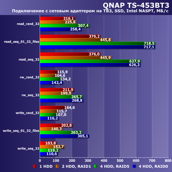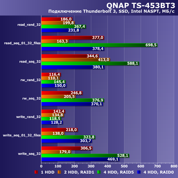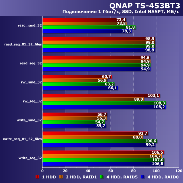 Четырехдисковый накопитель уже может рассматриваться и для установки в него SSD, поскольку обычно модели на один или два отсека считаются бюджетными и ставить в них SSD даже любого объема немного странно. Учитывая показанные с HDD результаты и наличие двух вариантом быстрых интерфейсов, мы решили проверить TS-453BT3 и с SSD. Правда, сами накопители в этот раз удалось найти только не очень большого объема. Но учитывая интерфейс SATA, маловероятно, что на других моделях результаты будут существенно отличаться.