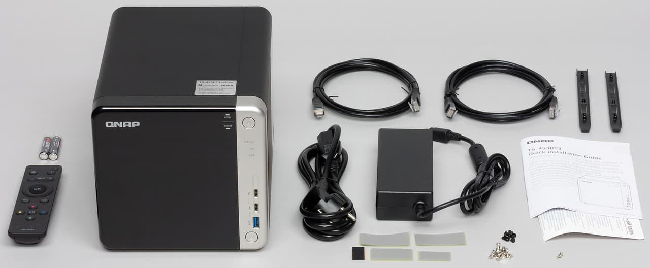 В комплект поставки входят внешний блок питания со съемным кабелем, два сетевых патч-корда, комплект винтов для накопителей 2,5″ и 3,5″, винты для SSD M.2, теплопроводящие прокладки для них, ИК-пульт дистанционного управления и пара батареек для него. Кроме того, присутствует краткая инструкция по началу работы в картинках и на нескольких языках и гарантийный талон.