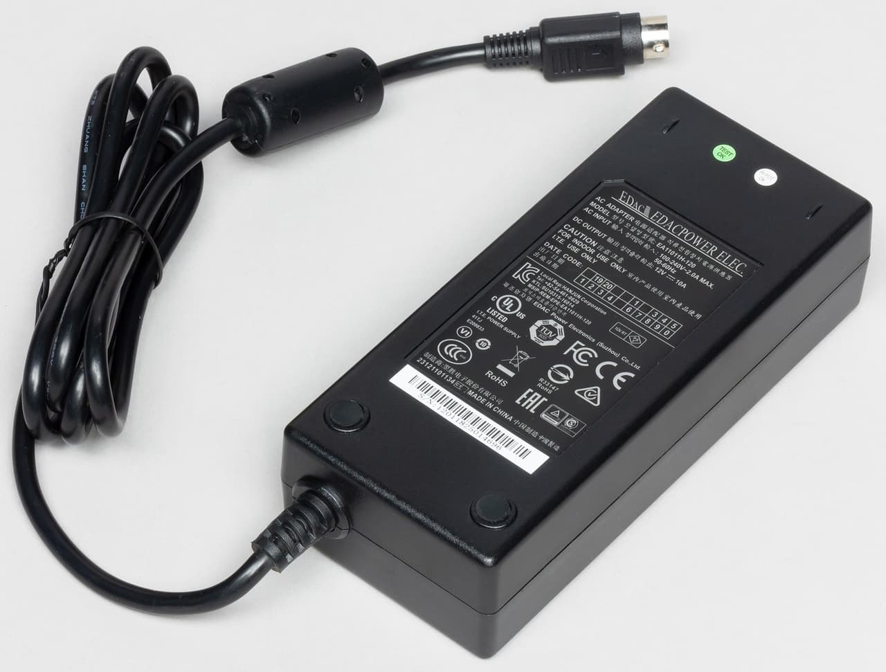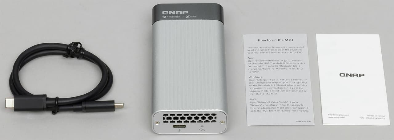 Блок питания имеет параметры 12 В 10 А (120 Вт) и подключается к сетевому накопителю специальным четырехконтактным штекером. Сетевые кабели имеют категорию 5e, так что для 10-гигабитного подключения придется покупать кабель дополнительно. Кабеля Thunderbolt 3 в комплекте также нет.